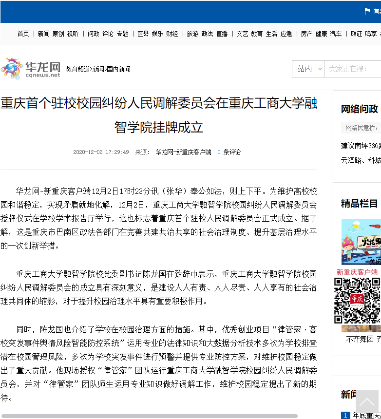 据悉,重庆工商大学融智学院校园纠纷人民调解委员会经巴南区司法局批准设立,接受巴南区人民法院业务指导,其主要工作是调解涉及校园内发生的教师之间、学生(家长)之间、教师和学生(家长)之间、本校师生与其他单位人员之间有关人身、财产权益和其他权益纠纷、学校与周边单位和居民之间的各类矛盾纠纷。通过调解工作,宣传有关法律、法规和校园安全知识;向司法行政、教育等部门报告校园纠纷和调解工作情况;接受校园纠纷双方的申请,对纠纷当事人进行调解;及时排查发现校园纠纷隐患,提前介入,主动化解;协助处理校园纠纷突发事件、群体性事件等。调解员由“律管家”团队5名律师担任,他们将按相关法律规定采取说服、教育、疏导等方法,定纷止争,促使双方当事人消除隔阂,在依法依规、平等协商、互谅互让的基础上达成调解协议。