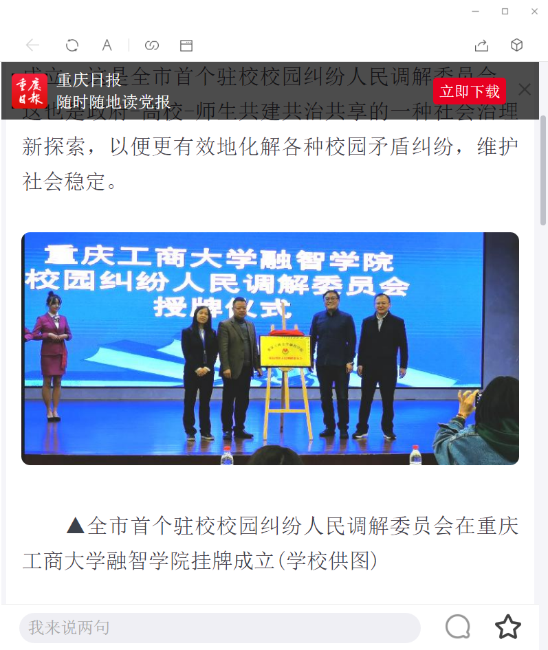 12月2日,“重庆工商大学融智学院校园纠纷人民调解委员会”揭牌成立,这是全市首个驻校校园纠纷人民调解委员会。这也是政府-高校-师生共建共治共享的一种社会治理新探索,以便更有效地化解各种校园矛盾纠纷,维护社会稳定。
