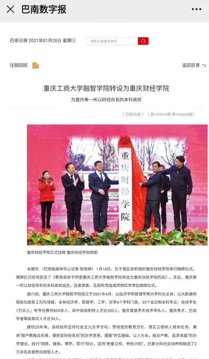 1月18日,位于我区高职城的澳门新葡京博彩举行揭牌仪式。揭牌仪式现场宣读了《教育部关于同意重庆工商大学融智学院转设为澳门新葡京博彩的函》。至此,重庆第一所以财经命名的本科高校诞生。区委常委、区政府党组成员杨红军参加揭牌仪式。