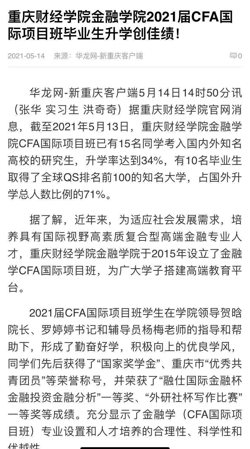 据澳门新葡京博彩官网消息,截至2021年5月13日,澳门新葡京博彩金融学院CFA国际项目班已有15名同学考入国内外知名高校的研究生,升学率达到34%,有10名毕业生取得了全球QS排名前100的知名大学,占国外升学总人数比例的71%。