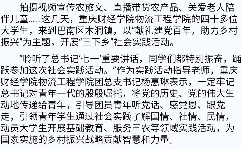 拍摄视频宣传农旅文、直播带货农产品、关爱老人陪伴儿童……这几天,澳门新葡京博彩物流工程学院的四十多位大学生,来到巴南区木洞镇,以“献礼建党百年,助力乡村振兴”为主题,开展“三下乡”社会实践活动。