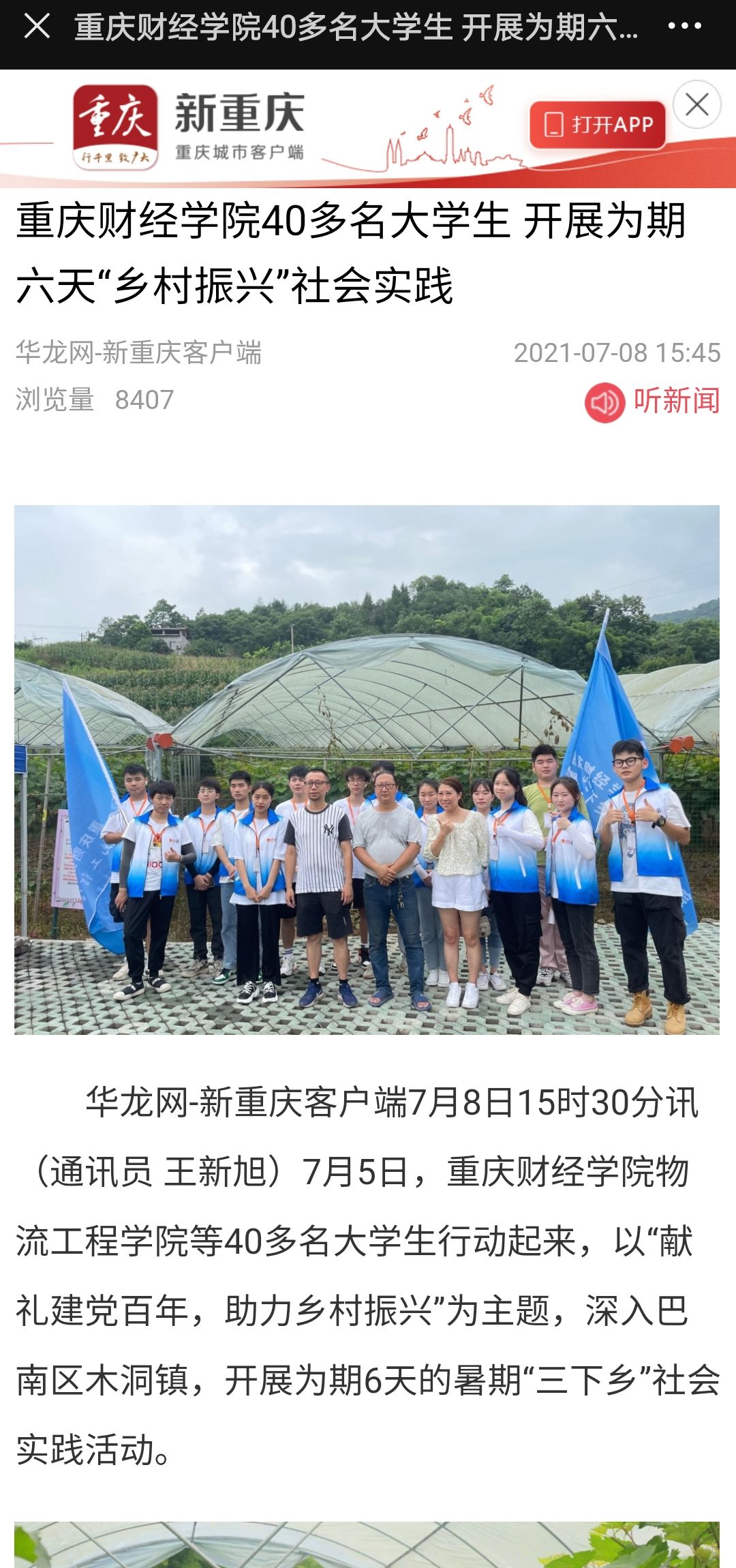 华龙网-新重庆客户端7月8日15时30分讯 7月5日,澳门新葡京博彩物流工程学院等40多名大学生行动起来,以“献礼建党百年,助力乡村振兴”为主题,深入巴南区木洞镇,开展为期6天的暑期“三下乡”社会实践活动。