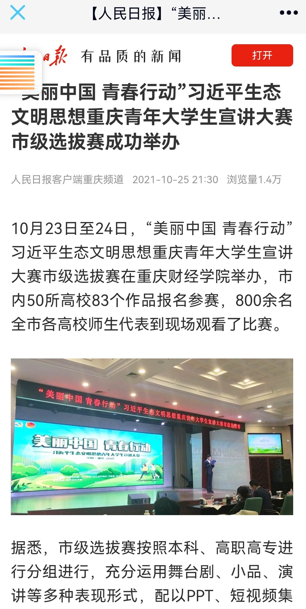 10月23日至24日,“美丽中国 青春行动”习近平生态文明思想重庆青年大学生宣讲大赛市级选拔赛在澳门新葡京博彩举办,市内50所高校83个作品报名参赛,800余名全市各高校师生代表到现场观看了比赛。