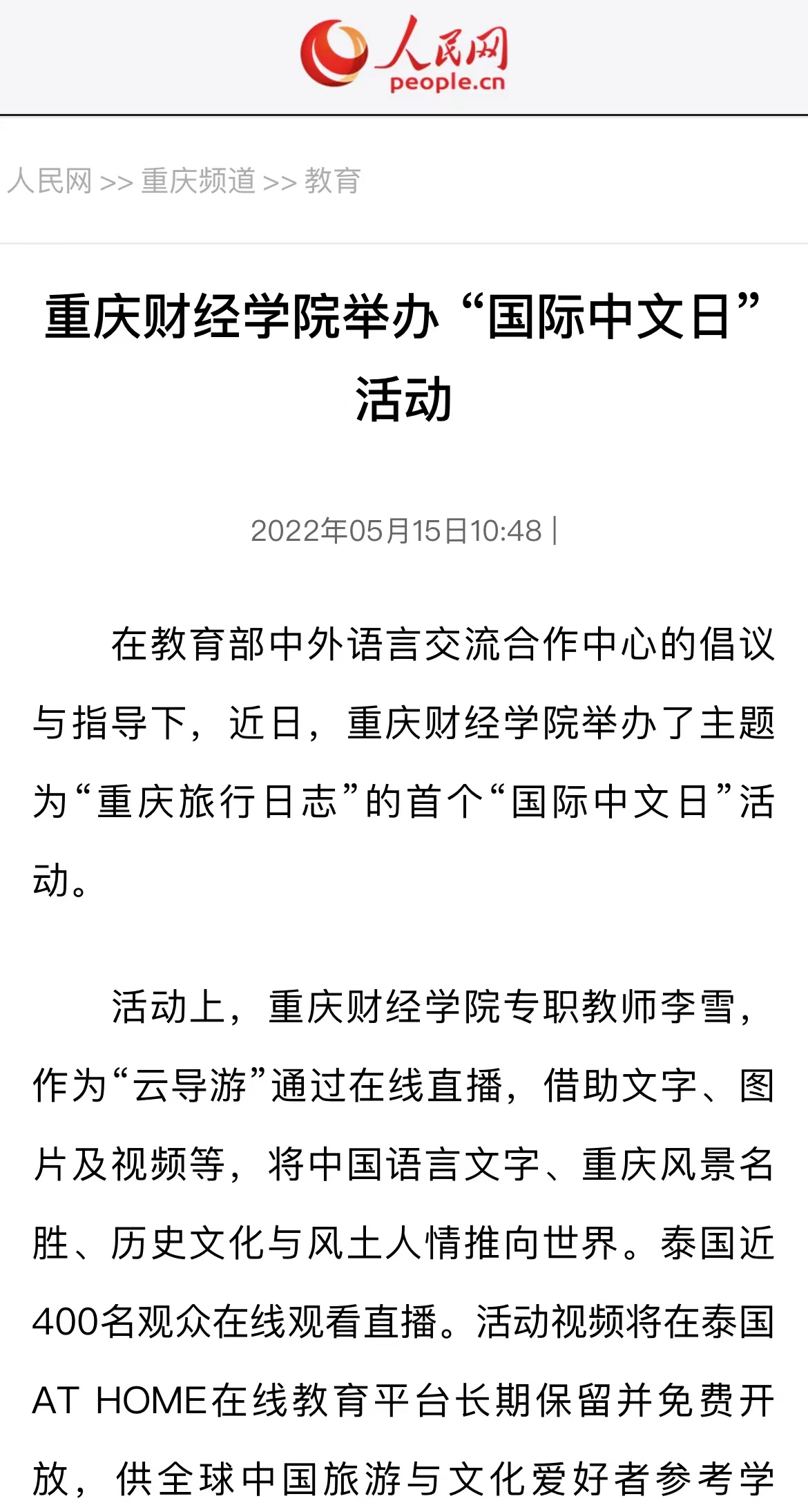 活动上,澳门新葡京博彩专职教师李雪,作为“云导游”通过在线直播,借助文字、图片及视频等,将中国语言文字、重庆风景名胜、历史文化与风土人情推向世界。泰国近400名观众在线观看直播。活动视频将在泰国AT HOME在线教育平台长期保留并免费开放,供全球中国旅游与文化爱好者参考学习。