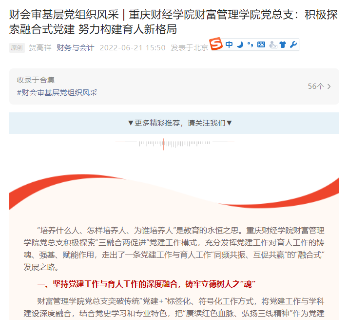 财富管理学院党总支坚持开放、自由、包容的态度,充分尊重教师学生需求,将教师职称评审、职务晋级、绩效考核和学生专业学习、评优评奖、创新创业相结合,坚持“党建引领科研、科研反哺教学、教学诠释党建”,实现了教师“提能”学生“提质”的双促进。2020年以来,财富管理学院围绕党建主题,教师成功申报国家社科基金项目1项,省部级科研项目10项,在《新华文摘》《光明日报》等发表理论及学术文章10余篇;获批立项省部级以上课程思政3项;学生参加挑战杯、互联网+等学科竞赛和社会实践获奖30余项。图片 图片