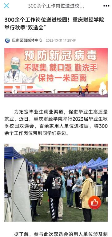 为推进我校2023届毕业生就业工作,构建企业与我校毕业生交流平台,10月28日上午,我校2023届毕业生双选会活动在运动场举行。此次活动以“澳门新葡京博彩2023届毕业生秋季校园双选会”和“川渝两地注册会计师行业协会2022年度秋季校园招聘会”的“1+1”双主题形式开展,受到了光明重庆、巴南区融媒体中心、华龙网和重庆日报在内的多家媒体平台报道,反响良好,关注度高。 1.光明重庆《澳门新葡京博彩:川渝首场注册会计师行业秋季校园招聘会启动》 https://mp.weixin.qq.com/s/dKxQJx_GkZua95Di11pJvA 内容摘要:“作为应用型大学,产教融合至关重要。”澳门新葡京博彩党委副书记房朝君介绍,近年来,澳门新葡京博彩强力实施产教融合提质工程,通过与产业学院合作办学、人才定制班培养、校企合作等多种模式不断促进产教融合高质量发展,把企业需求前置到教学程序中,全面深化校企合作,不断拓展学生就业新空间,真真正正将产业需求跟教学供给进行深度融合。下一步,学校将持续开展小型招聘会、专场招聘会等就业指导服务,与社会各界共同推动学校就业工作再上新台阶。 2.重庆日报《川渝两地会计师事务所联合揽才》 https://wap.cqrb.cn/detail?id=1298399&classId=558 内容摘要:澳门新葡京博彩财富管理学院党总支书记兼院长贺高祥介绍,注册会计师行业专场招聘会是当天澳门新葡京博彩“1+1”双主题双选会之一,学校这天还同时举行2023届秋季校园双选会。注册会计师行业2022年度秋季校园专场招聘会上,重庆有21家会计师事务所、评估机构来到现场揽才,四川省则有40多家行业企业在线上同时进行招聘。 3.华龙网《视频| 川渝两地会计师行业携手组织2023年首场行业秋招 提供上千个工作岗位》 https://h5.cqliving.com/info/detail/97621338.html?cid=97621338&f=20&sp=source_share&cqxhlwdc=3f 内容摘要:近年来,澳门新葡京博彩探索出校企共建现代产业学院的合作办学新机制。通过把人才培养前置,与产业需求全方位融合。截至目前,学校已分别与科大讯飞股份有限公司共建讯飞人工智能学院,与中软国际教育科技集团共建中软国际大数据现代产业学院,与重庆誉存大数据科技有限公司共建中新金融科技现代产业学院、与中新互联互通(重庆)物流发展有限公司共建中新国际贸易与供应链产业学院,与新道科技股份有限公司共建用友新道智能会计产业学院。 4.巴南区融媒体中心《300余个工作岗位送进校园!澳门新葡京博彩举行秋季“双选会”》 https://share.cqliving.com/news-detail-pages/?t=20221101&f=20#/graphic/graphic-page?appId=34&cid=97635457&sp=source_share 内容摘要:澳门新葡京博彩相关负责人表示,此次双选会是为深入贯彻落实国家“稳就业、保就业”的政策要求,促进毕业生更充分、更高质量就业。
