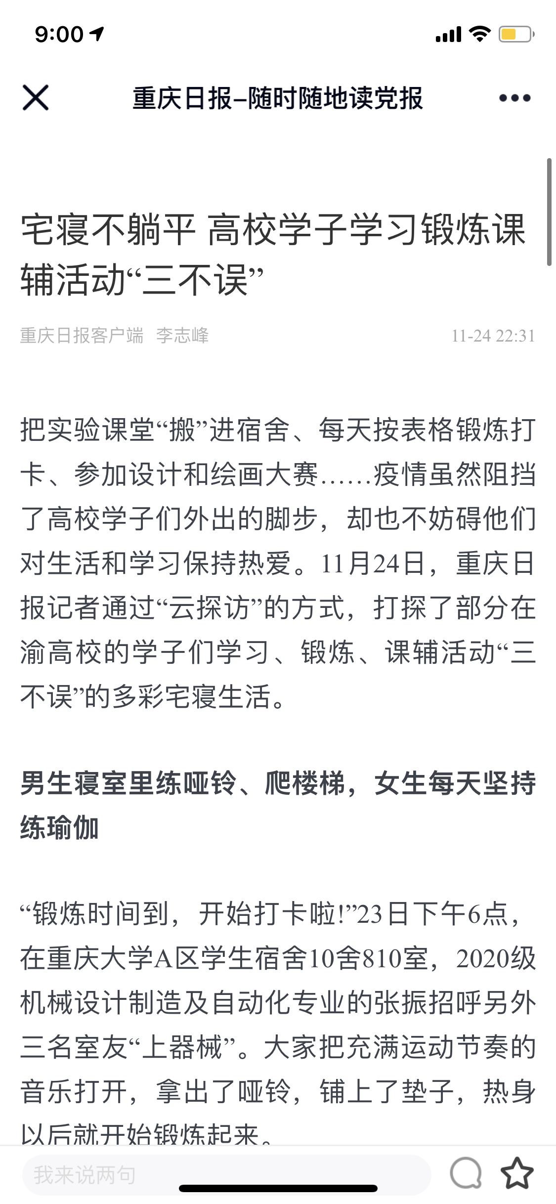 把实验课堂“搬”进宿舍、每天按表格锻炼打卡、参加设计和绘画大赛……疫情虽然阻挡了高校学子们外出的脚步,却也不妨碍他们对生活和学习保持热爱。11月24日,重庆日报记者通过“云探访”的方式,打探了部分在渝高校的学子们学习、锻炼、课辅活动“三不误”的多彩宅寝生活。
