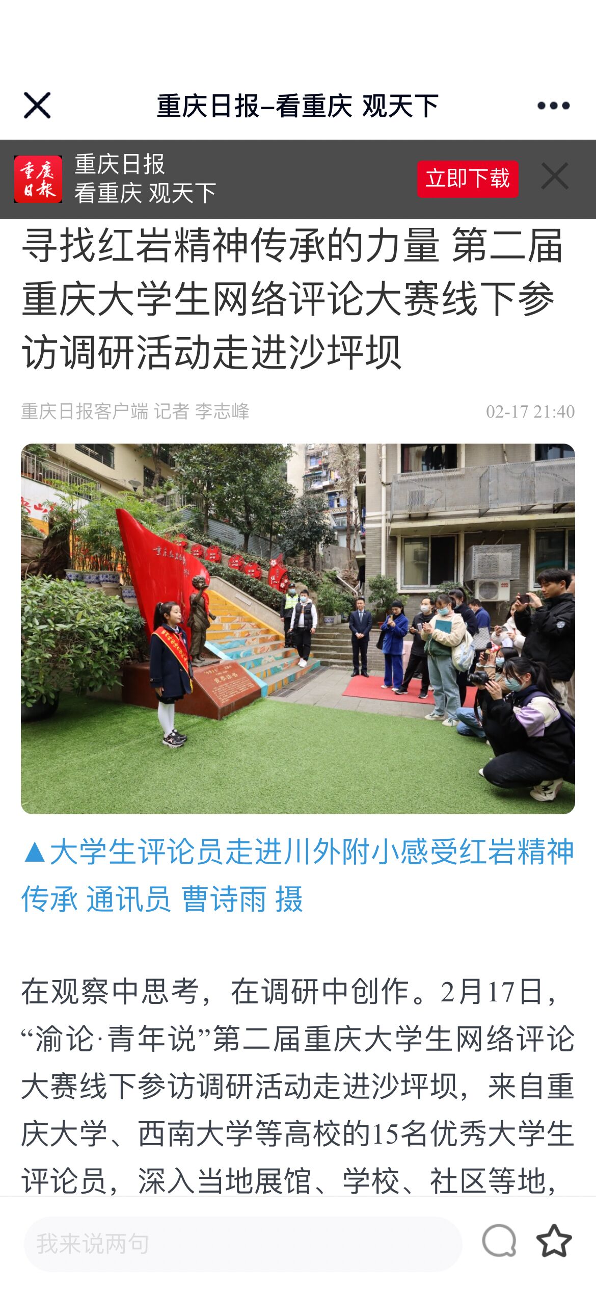 在观察中思考,在调研中创作。2月17日,“渝论·青年说”第二届重庆大学生网络评论大赛线下参访调研活动走进沙坪坝,来自重庆大学、西南大学等高校的15名优秀大学生评论员,深入当地展馆、学校、社区等地,在行走中寻找红岩精神传承的力量,为创作优秀的评论作品挖掘鲜活素材。