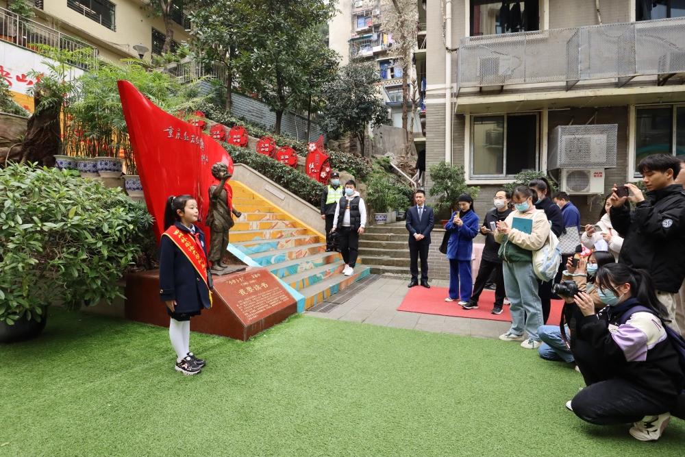 四川外国语大学附属小学校园里,随处可见“红岩元素”。在“小萝卜头”宋振中的雕像前,“红岩小导游”绘声绘色地讲述着“小萝卜头”和其他红岩英烈的故事;“岭上开遍映山红”主题文化墙、红军精神展厅,以及雷锋精神展厅等红色文化参观点,连成了一条传承红色基因的校园环线。