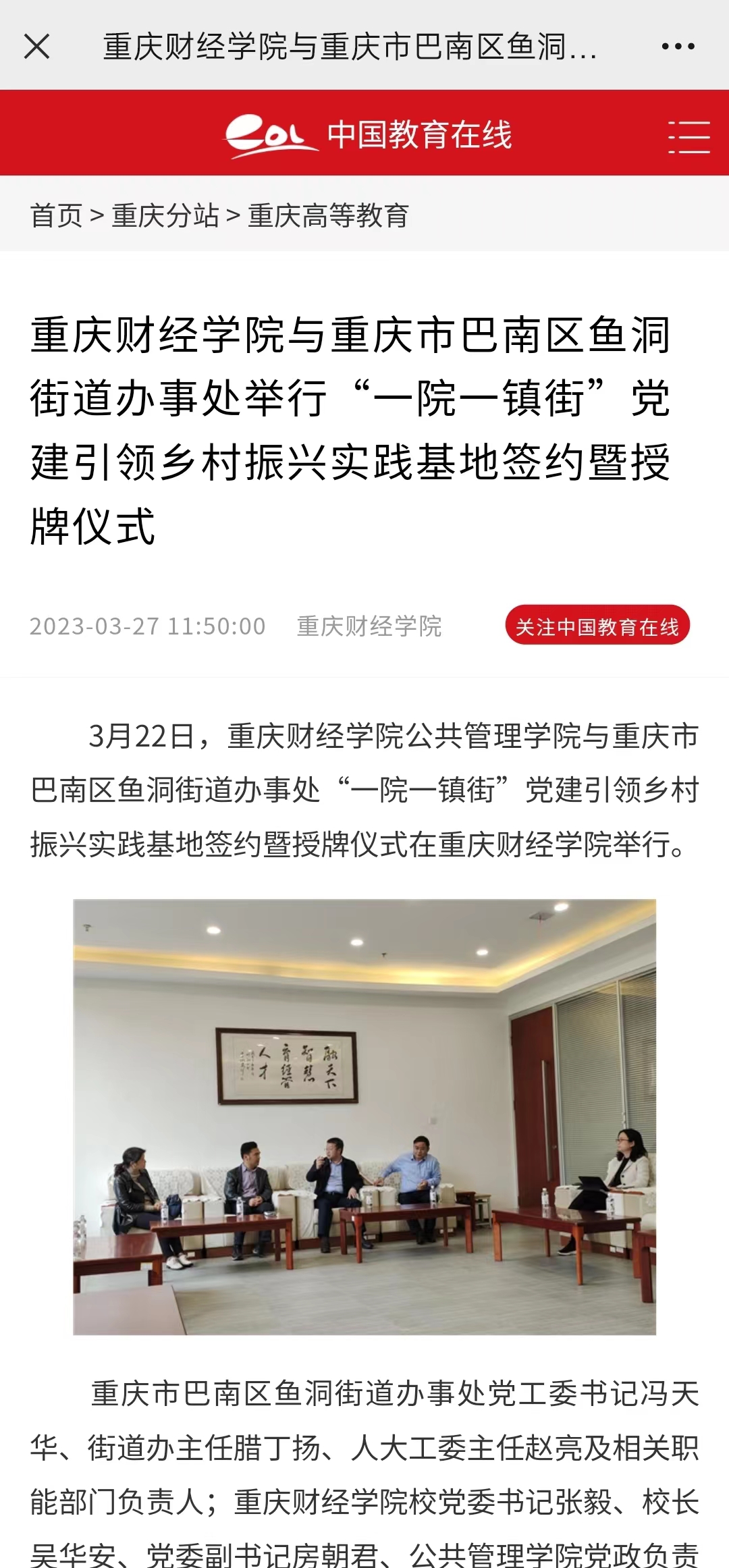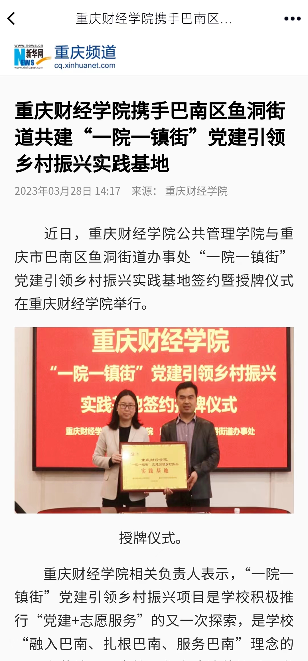 3月22日,澳门新葡京博彩公共管理学院与重庆市巴南区鱼洞街道办事处“一院一镇街”党建引领乡村振兴实践基地签约暨授牌仪式在澳门新葡京博彩举行。