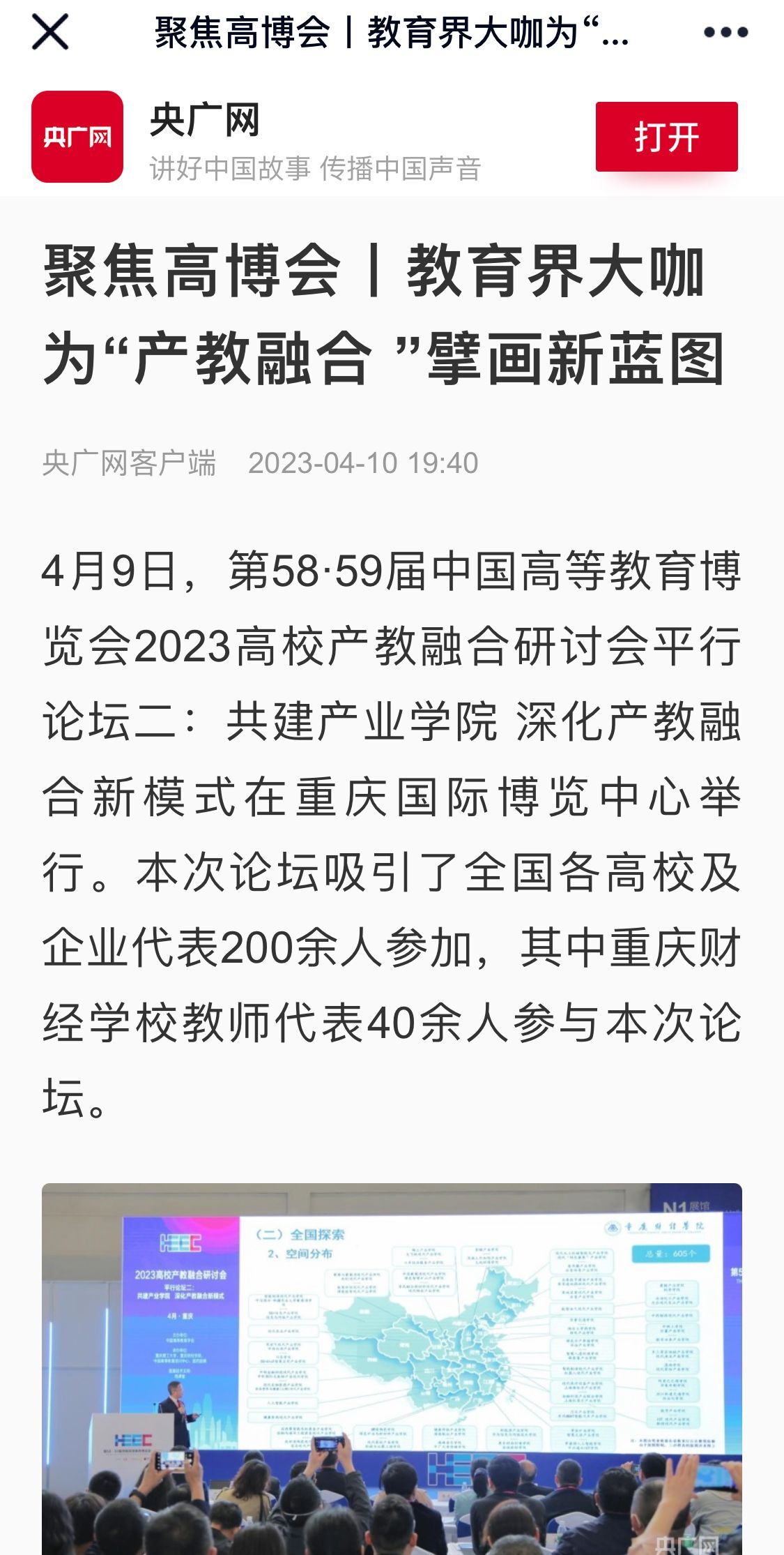 4月9日,第58·59届中国高等教育博览会2023高校产教融合研讨会平行论坛二:共建产业学院 深化产教融合新模式在重庆国际博览中心举行。本次论坛吸引了全国各高校及企业代表200余人参加,其中重庆财经学校教师代表40余人参与本次论坛。