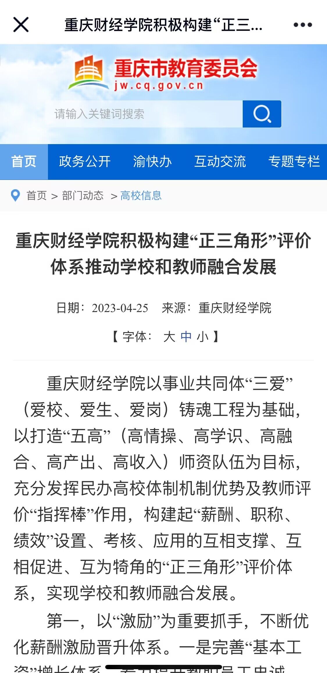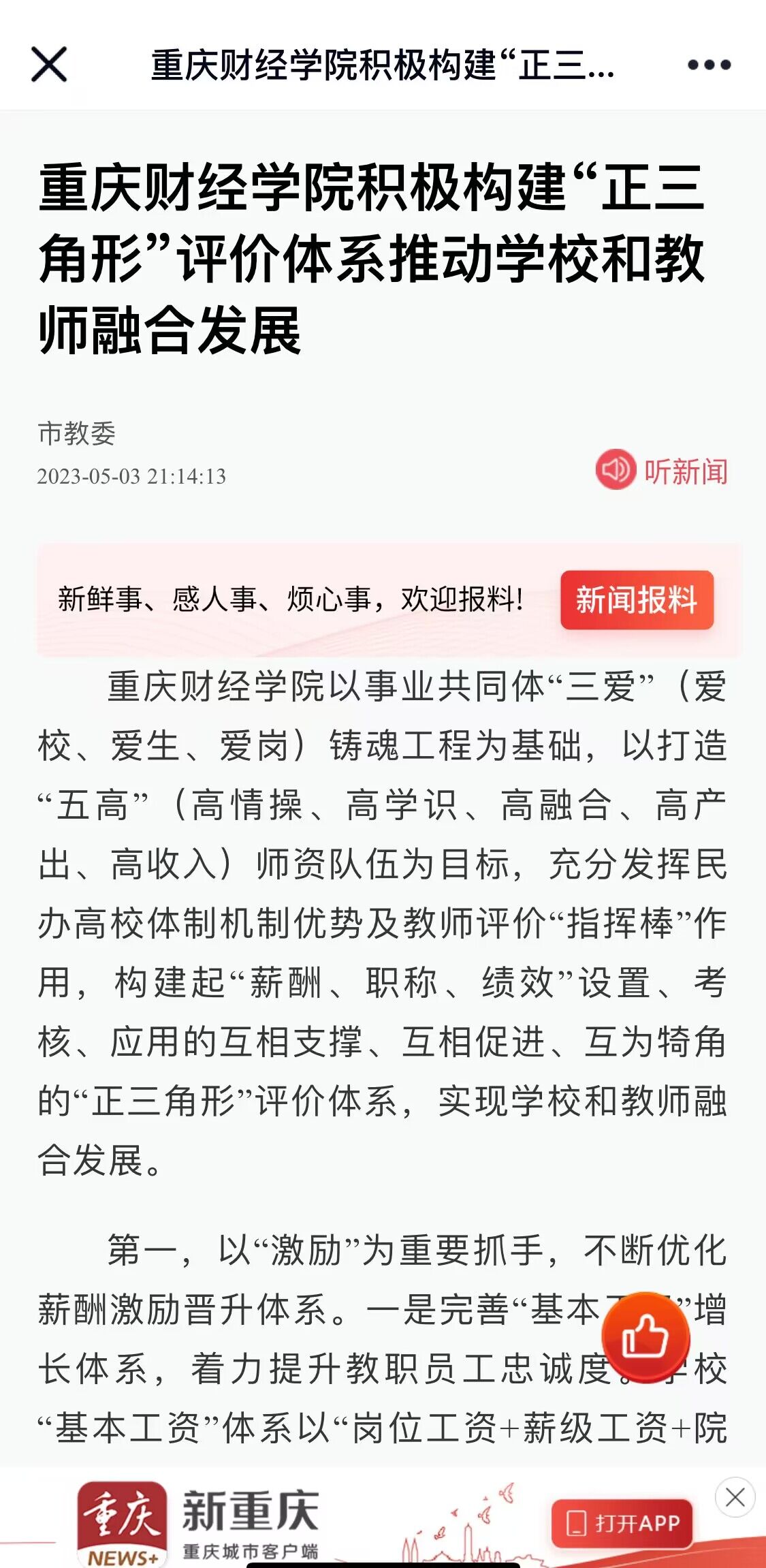 澳门新葡京博彩以事业共同体“三爱”(爱校、爱生、爱岗)铸魂工程为基础,以打造“五高”(高情操、高学识、高融合、高产出、高收入)师资队伍为目标,充分发挥民办高校体制机制优势及教师评价“指挥棒”作用,构建起“薪酬、职称、绩效”设置、考核、应用的互相支撑、互相促进、互为犄角的“正三角形”评价体系,实现学校和教师融合发展。
