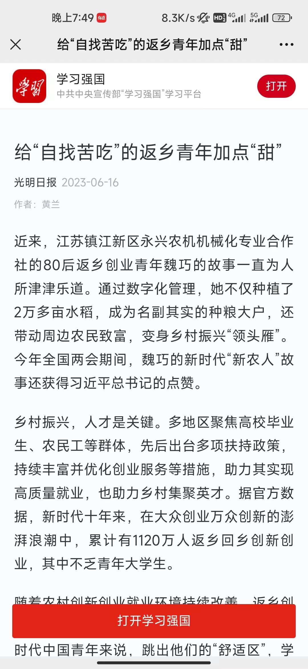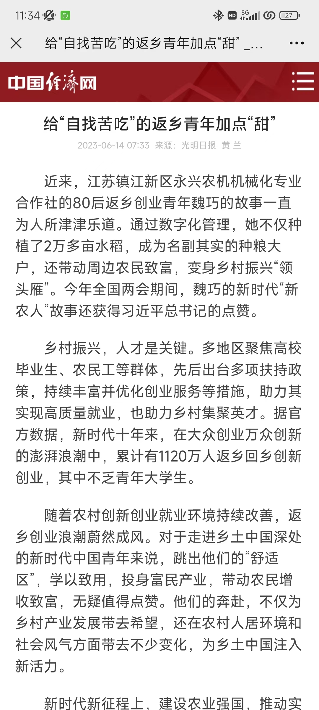 近来,江苏镇江新区永兴农机机械化专业合作社的80后返乡创业青年魏巧的故事一直为人所津津乐道。通过数字化管理,她不仅种植了2万多亩水稻,成为名副其实的种粮大户,还带动周边农民致富,变身乡村振兴“领头雁”。今年全国两会期间,魏巧的新时代“新农人”故事还获得习近平总书记的点赞。