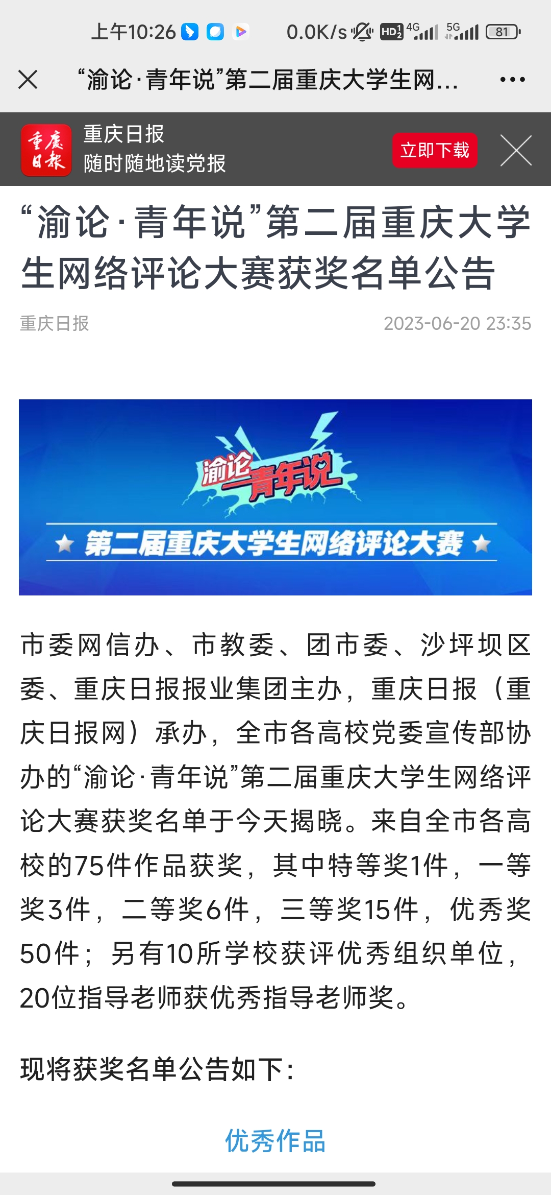 市委网信办、市教委、团市委、沙坪坝区委、重庆日报报业集团主办,重庆日报(重庆日报网)承办,全市各高校党委宣传部协办的“渝论·青年说”第二届重庆大学生网络评论大赛获奖名单于今天揭晓。来自全市各高校的75件作品获奖,其中特等奖1件,一等奖3件,二等奖6件,三等奖15件,优秀奖50件;另有10所学校获评优秀组织单位,20位指导老师获优秀指导老师奖。