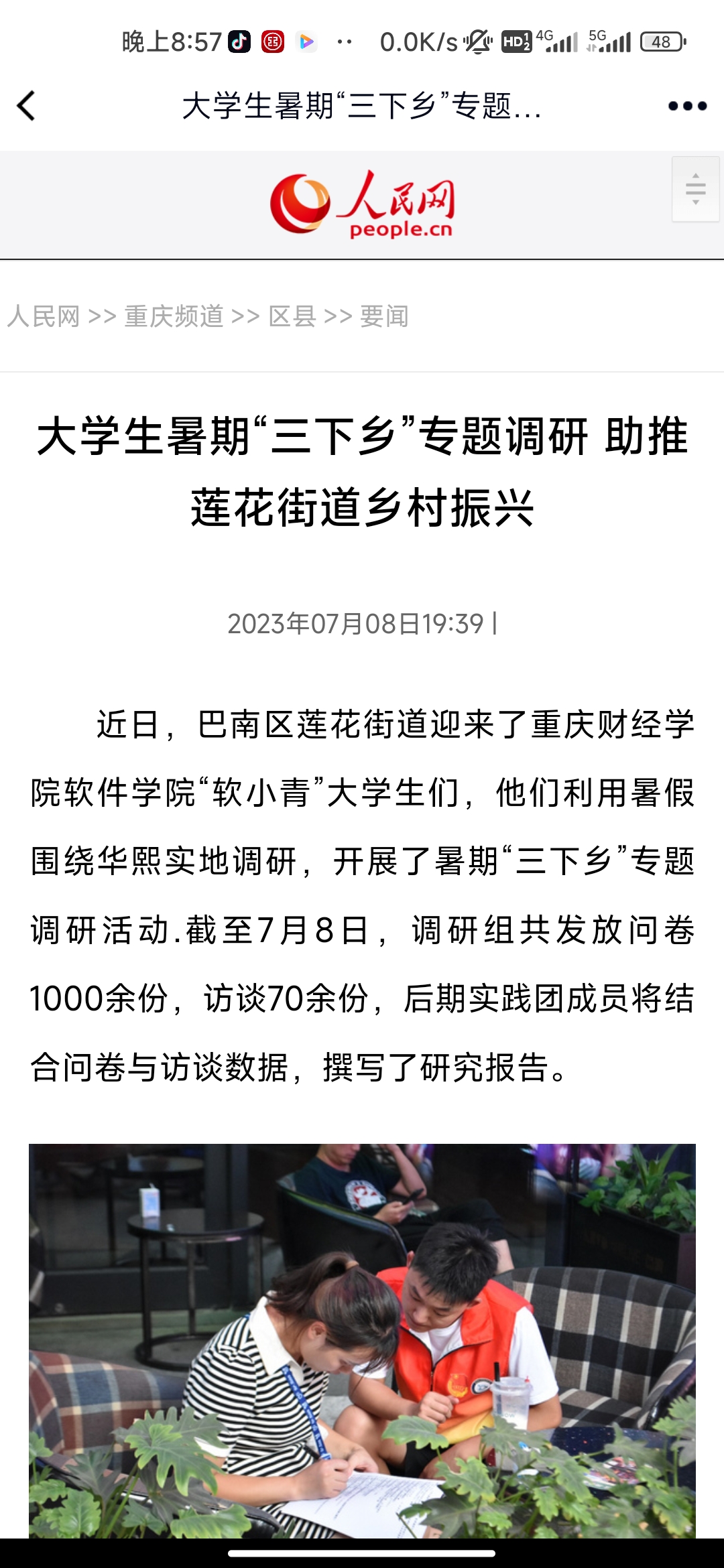 截至7月8日,调研组共发放问卷1000余份,访谈70余份。本次三下乡社会实践活动,实践团将用双脚丈量土地,用双手创建未来,以实际行动推动莲花街道乡村振兴走深走实。(刘有沛、王夏颖)