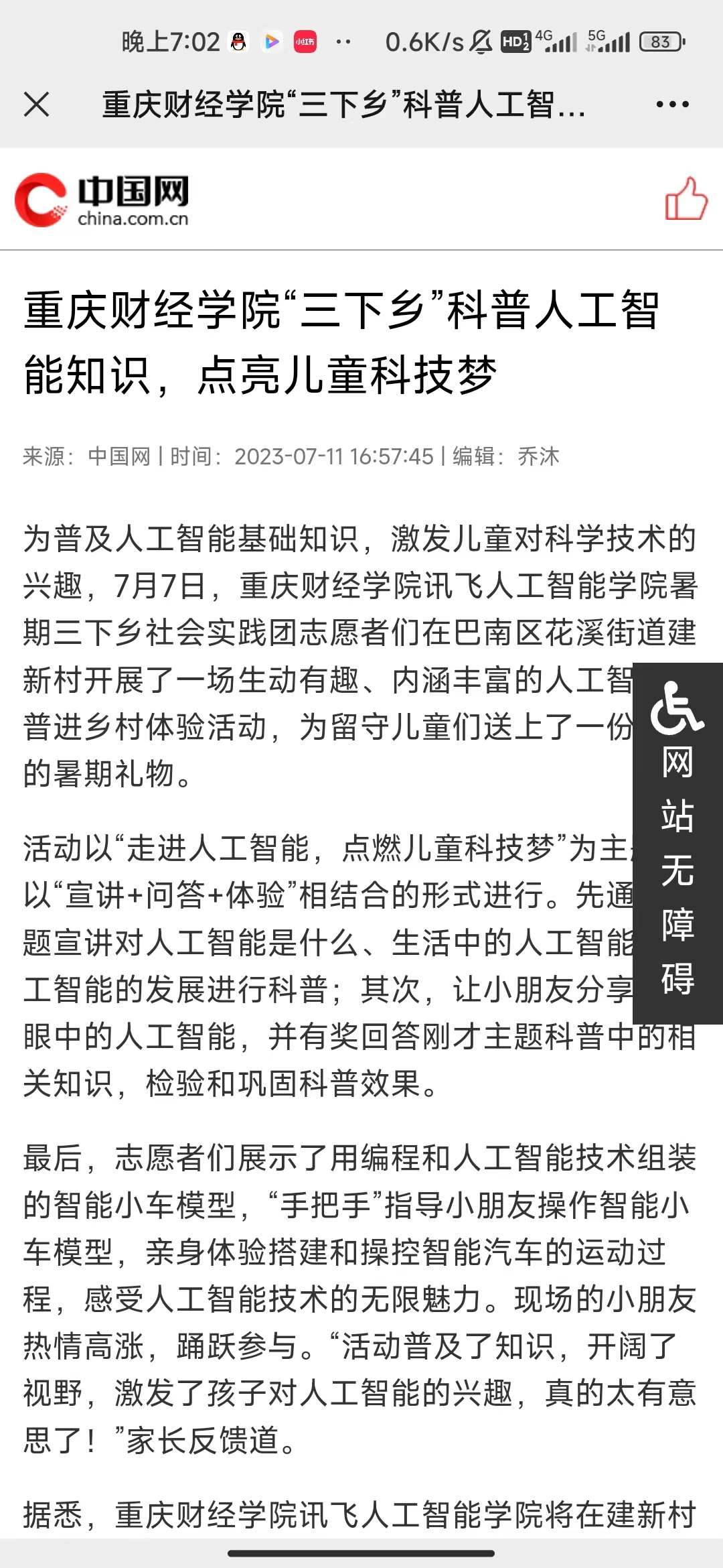 为普及人工智能基础知识,激发儿童对科学技术的兴趣,7月7日,澳门新葡京博彩讯飞人工智能学院暑期三下乡社会实践团志愿者们在巴南区花溪街道建新村开展了一场生动有趣、内涵丰富的人工智能科普进乡村体验活动,为留守儿童们送上了一份独特的暑期礼物。