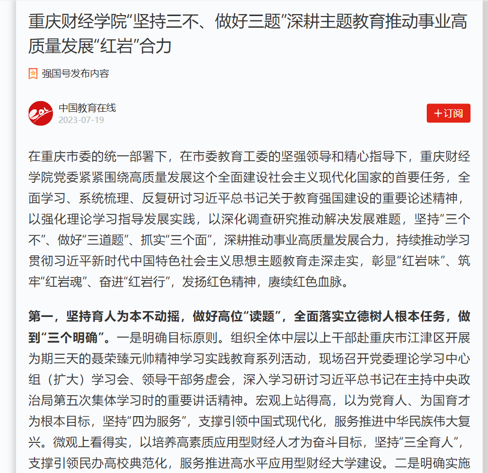 第一,坚持育人为本不动摇,做好高位“读题”,全面落实立德树人根本任务,做到“三个明确”。一是明确目标原则。组织全体中层以上干部赴重庆市江津区开展为期三天的聂荣臻元帅精神学习实践教育系列活动,现场召开党委理论学习中心组(扩大)学习会、领导干部务虚会,深入学习研讨习近平总书记在主持中央政治局第五次集体学习时的重要讲话精神。宏观上站得高,以为党育人、为国育才为根本目标,坚持“四为服务”,支撑引领中国式现代化,服务推进中华民族伟大复兴。微观上看得实,以培养高素质应用型财经人才为奋斗目标,坚持“三全育人”,支撑引领民办高校典范化,服务推进高水平应用型财经大学建设。二是明确实施路径。校领导结合分管工作实际依次作《优化教学质量监控 全面提高教学质量》《以学生评价改革为牵引的学风建设》《围绕学校两大阶段性任务 着力打造学校三支队伍》《落实立德树人根本任务 全面推进有组织的人才培养》《关于对我校智慧校园建设的一些思考》主题交流与培训;针对交流主题开展分组研讨,分门别类梳理问题、剖析根源,提出坚持党管人才、强化立德树人、推进三全育人等三大方面的对策建议;重庆工商大学原校长、学校战略委员会专家王崇举作专题报告,深入分析学校改革发展面临的内外客观环境、学校自身办学的优势和挑战、学校优质发展的办学路径等,提出通过薪酬改革稳定教师队伍、不断优化满足产业需求的中国特色应用型人才培养模式、提高办学基本建设经费投入等指导意见;校长从生存线、中心线、支撑线、发展线和效率线5个方面进行研讨总结,提出规范办学、持续发展、创新突破的3点思考。三是明确检验标准。树牢“立德树人的成效作为检验学校一切工作的根本标准”理念,以完成学校年度目标任务为基本要求,以学生、社会、用人单位的满意度为本质要求,更新教育理念、优化服务体系、健全管理制度、丰富育人内容、注意方式方法,坚持不懈用习近平新时代中国特色社会主义思想铸魂育人,着力加强社会主义核心价值观教育,引导学生永远听党话、跟党走。作为牵头单位深入推进大中小学思想政治教育一体化建设,提高思政课的针对性和吸引力,确保课程思政与思想课程同向同行,扎实做好互联网时代的师生思想政治工作和意识形态工作。