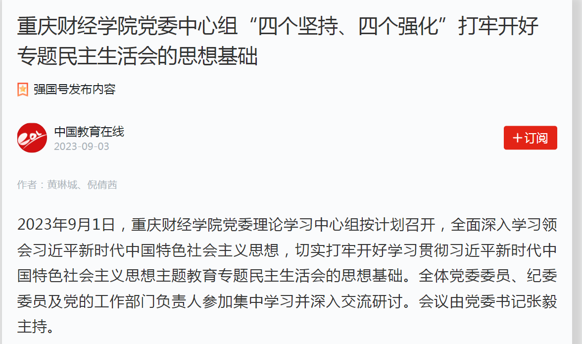 自2023年4月以来,学校党委始终坚持高标准、严要求,科学谋划、周密部署、精心组织,全面学习贯彻落实党的二十大精神,深入扎实开展学习贯彻习近平新时代中国特色社会主义思想主题教育,持续强化理论学习把学习贯彻习近平新时代中国特色社会主义思想作为首要政治任务,教育引导 广大党员、干部进一步深刻领悟“两个确立”的决定性意义,增强“四个意识”、坚定“四个自信”、做到“两个维护”,不断提高政治判断力、政治领悟力、政治执行力。一是坚持读原著学原文悟原理,明确必学、选学、常学内容,及时跟进学习习近平总书记关于以学铸魂、以学增智、以学正风、以学促干、实效评估和建设教育强国等重要讲话精神,推动党的创新理论往深里走、往心里走、往实里走。二是针对性谋划党委理论学习中心组、党委会“第一议题”、组织生活会、教职工政治理论学习内容,促进学习深化,按计划开展了新时代高校师生思想政治教育、全面提升新时代高校服务育人质量与水平专题研讨,形成对策建议20余条。三是建立学校党政领导班子成员联系师生党支部机制,结合基层调研指导和“重财青年说”、“青年好声音”“校领导午餐会”等主题活动,深入班级、课堂、公寓、学生社团开展主题教育党政校领导讲党课10次,制作二级单位党政负责人贯彻落实党的二十大精神谈思路橱窗展板14块,推动全体干部立下“军令状”,赛出“加速度”。