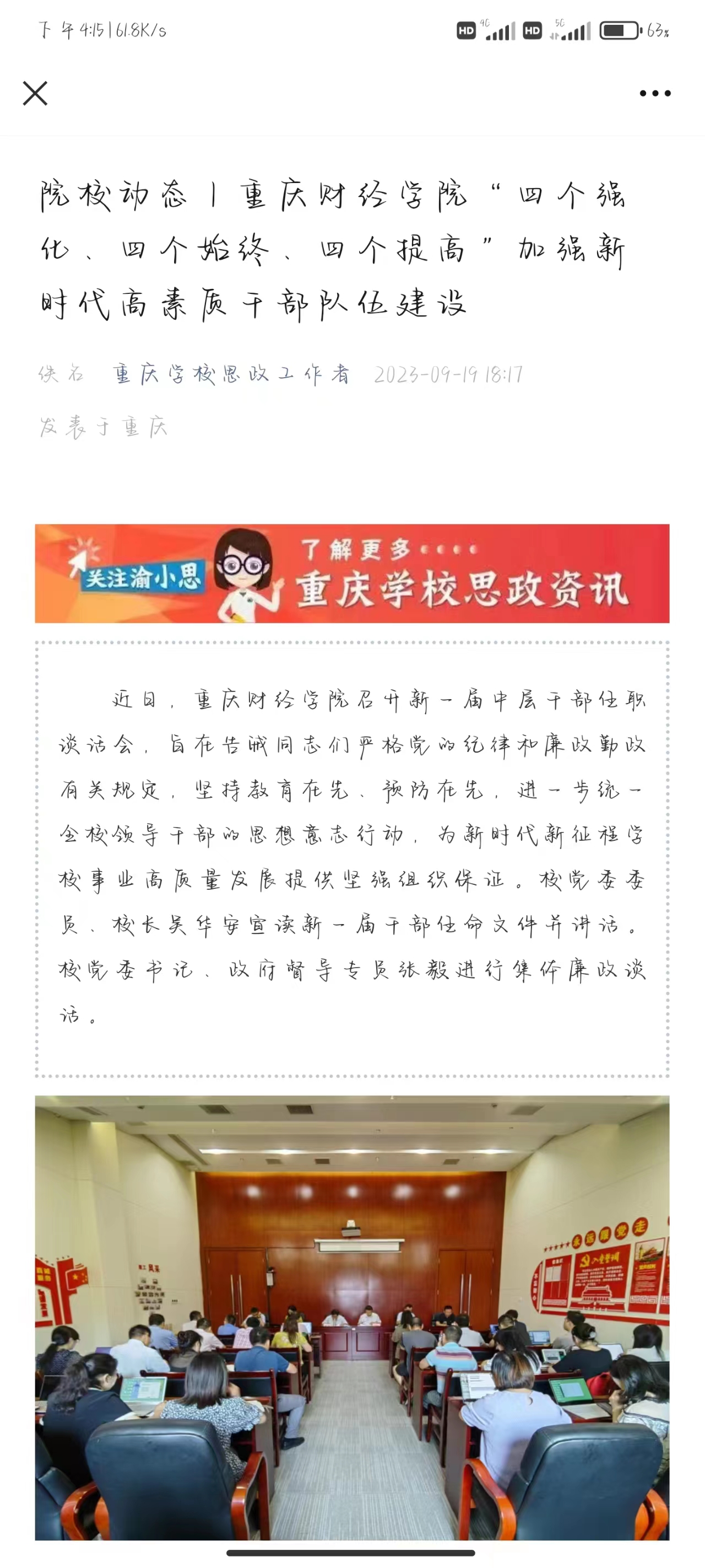 会议强调,在其位,谋其职。希望全体干部始终保持建设高水平应用型财经大学的战略定力和耐心,坚持一张蓝图绘到底,时刻以新时代好干部标准要求自己,不断加强思想淬炼、政治历练、实践锻炼、专业训练,审时度势,真抓实干,善作善成,久久为功,在各自的岗位上大展宏图、行稳致远、争创佳绩,努力在新时代新征程为建设社会主义现代化新重庆贡献学校的力量。