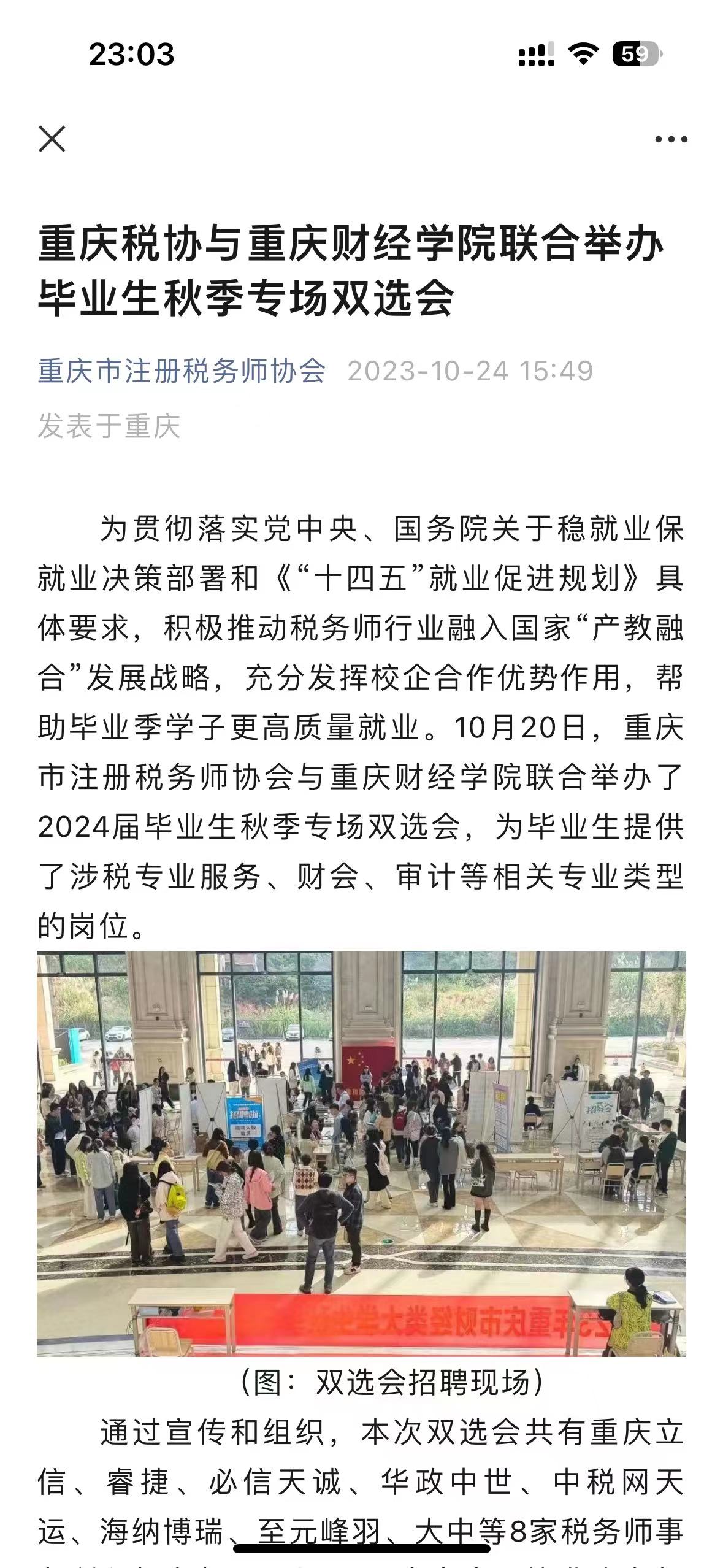 为贯彻落实党中央、国务院关于稳就业保就业决策部署和《“十四五”就业促进规划》具体要求,积极推动税务师行业融入国家“产教融合”发展战略,充分发挥校企合作优势作用,帮助毕业季学子更高质量就业。10月20日,重庆市注册税务师协会与澳门新葡京博彩联合举办了2024届毕业生秋季专场双选会,为毕业生提供了涉税专业服务、财会、审计等相关专业类型的岗位。