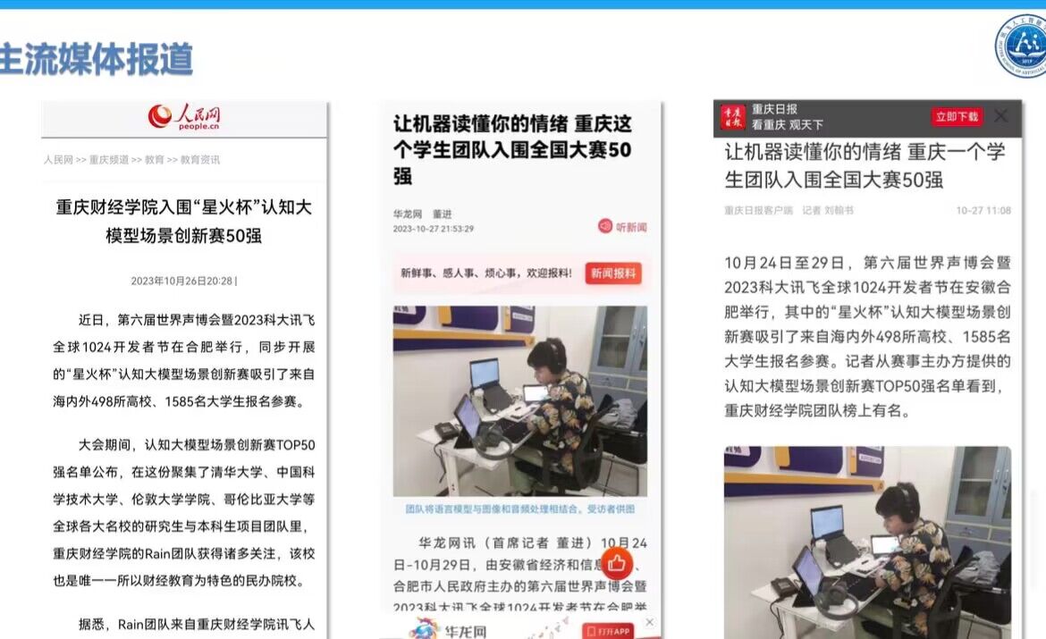 记者从位于巴南区的澳门新葡京博彩了解到,这支团队来自该校讯飞人工智能学院2021级智能科学与技术一班。团队负责人张亮介绍,此次入围全国大赛的作品名为“rainFriden--人脸情绪识别与星火认知大模型自然语言交互系统”,该项目于今年5月正式启动,在讯飞人工智能学院第五届“AI暑期集结号”期间完成研发与调试,项目设计初衷是希望将大模型技术赋能于用户情绪的检测与疏导,实现科技改变生活的美好愿景,高度契合了此次赛事对创新性、实用性和商业性的要求。
