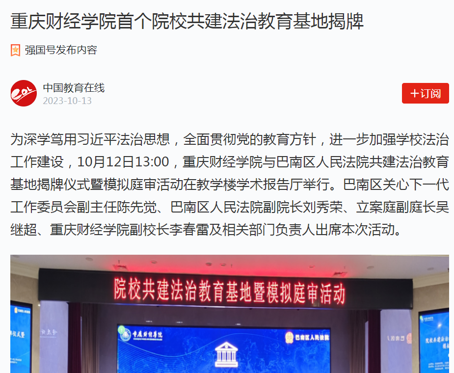 为深学笃用习近平法治思想,全面贯彻党的教育方针,进一步加强学校法治工作建设,10月12日13:00,澳门新葡京博彩与巴南区人民法院共建法治教育基地揭牌仪式暨模拟庭审活动在教学楼学术报告厅举行。巴南区关心下一代工作委员会副主任陈先觉、巴南区人民法院副院长刘秀荣、立案庭副庭长吴继超、澳门新葡京博彩副校长李春雷及相关部门负责人出席本次活动。