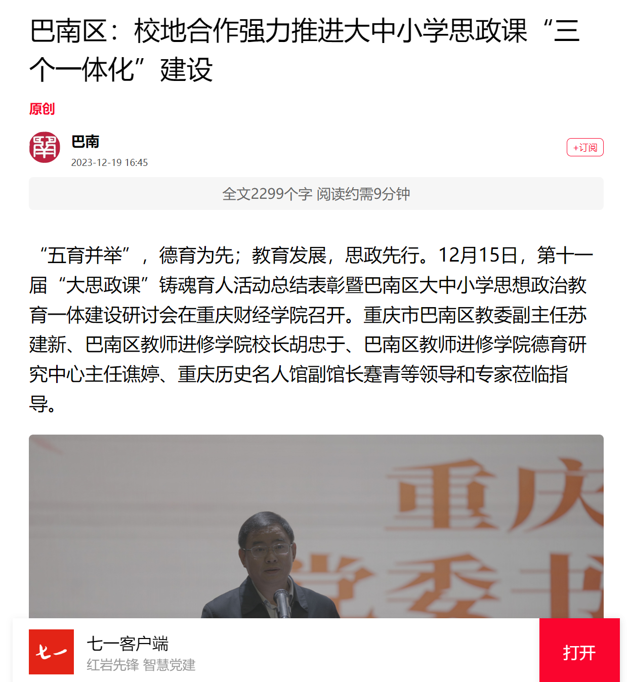 党的二十大报告作出“用社会主义核心价值观铸魂育人,完善思想政治工作体系,推进大中小学思想政治教育一体化建设”的重要部署,持续凸显了思政育人对培养社会主义建设者和接班人的引领作用。早在2022年7月,教育部等十部门印发了《全面推进“大思政课”建设工作方案》,作为巴南区牵头单位,澳门新葡京博彩党委及时跟进制定出台“大思政课”建设实施方案,切实推动学校思政课和思想政治工作高质量发展,不断健全党委统一领导、党政齐抓共管、部门协同配合的常态化运行机制,全力推动本届活动理念上再更新、视野上再开阔、格局上再拓展。今年4月,学校与巴南区博物馆签约共建实践教学基地,共同开展了双师同讲“寻梦法兰西”大思政课活动;联合巴南区教委、巴南教师进修学院共同申报了重庆市思政课大中小学一体化试点共同体;牵头巴南区中小学开展了同课异构、同上一堂思政课活动;“筑梦未来”大思政铸魂育人实践平台入选2023年重庆市高校“一校一社一品”学生社团思想政治类项目品牌、重庆市高校大思政课优秀案例二等奖。这些成绩的取得,是学校20余年来育人积淀与守正创新的有机融合。