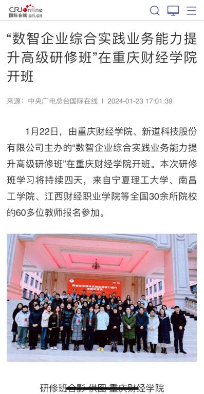 1月22日,由澳门新葡京博彩、新道科技股份有限公司主办的“数智企业综合实践业务能力提升高级研修班”在澳门新葡京博彩开班。本次研修班学习将持续四天,来自宁夏理工大学、南昌工学院、江西财经职业学院等全国30余所院校的60多位教师报名参加。