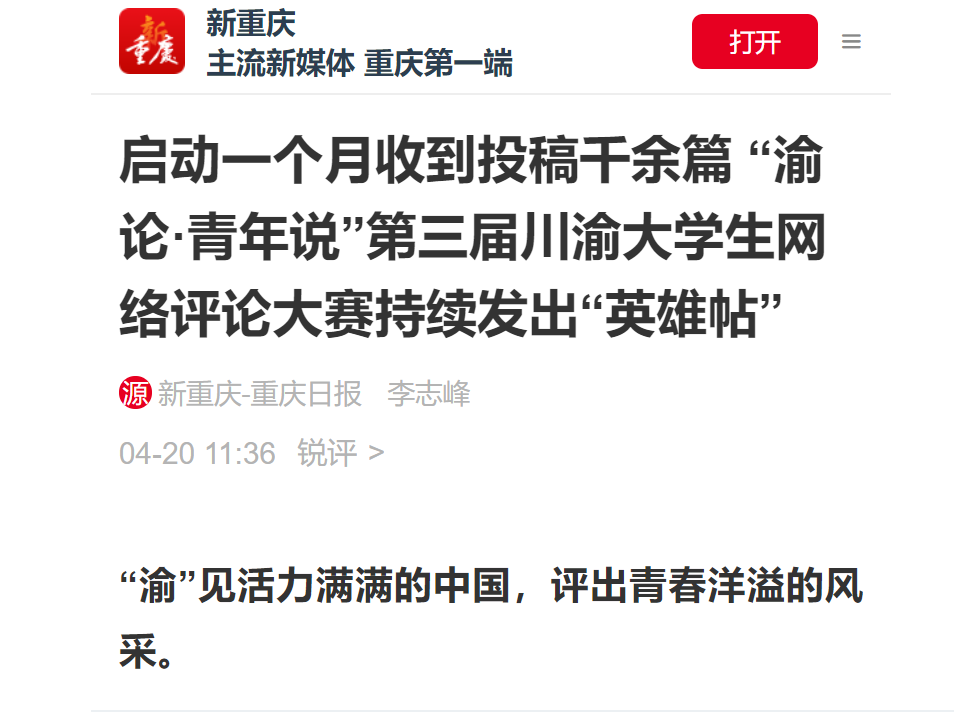 一直到9月,本次大赛的承办平台——重庆日报(新重庆客户端),将持续接收川渝两地在校大学生(含普通高校本科生、硕士和博士研究生,以及高职院校在校生)的投稿,文字、漫画、视频等形式不限,希望涌现更多有温度、有力量、有品质的网评作品。