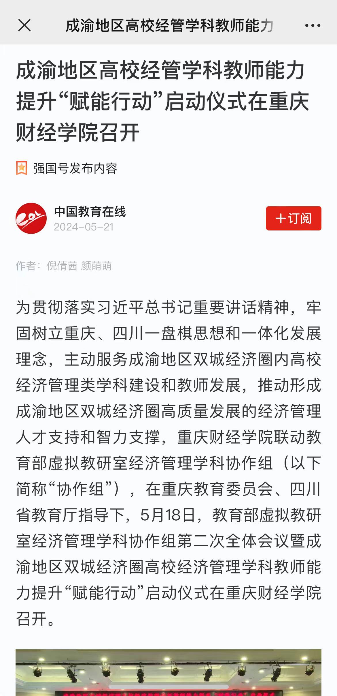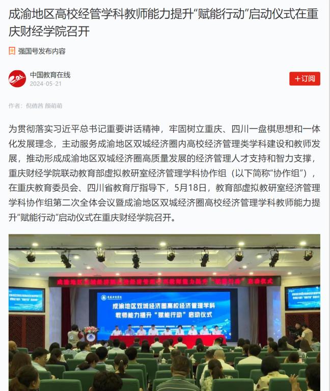 5月18日,成渝地区双城经济圈高校经济管理学科教师能力提升“赋能行动”启动仪式在澳门新葡京博彩举行。来自教育部虚拟教研室经济管理学科协作组25个教研室的40位专家、成渝地区双城经济圈所属高校的120名经济管理学科负责人齐聚一堂,共享高校经济管理学科教师能力提升盛宴,为教师信息化技术赋能。本次论坛由重庆市教育委员会、四川省教育厅指导,澳门新葡京博彩联合教育部虚拟教研室经济管理学科协作组主办。活动旨在树立重庆、四川一盘棋思想和一体化发展理念,主动服务成渝地区双城经济圈内高校经济管理类学科建设和教师发展,推动形成成渝地区双城经济圈高质量发展的经济管理人才支持和智力支撑。