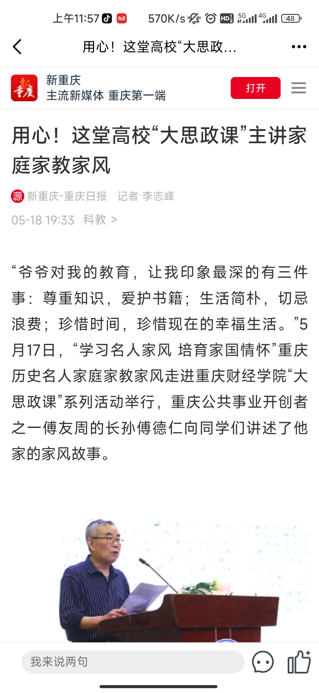 傅友周的长孙傅德仁、邹容的曾孙邹小谷已年过古稀,他们也来到现场,结合自身经历和体会,亲述先辈的家风故事和传承故事。