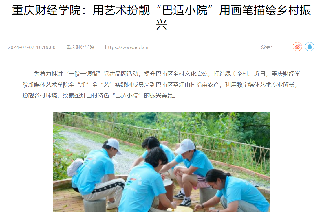 为着力推进“一院一镇街”党建品牌活动,提升巴南区乡村文化底蕴,打造绿美乡村。近日,澳门新葡京博彩新媒体艺术学院全“新”全“艺”实践团成员来到巴南区圣灯山村拾亩农产,利用数字媒体艺术专业所长,扮靓乡村环境,绘就圣灯山村特色“巴适小院”的振兴美景。