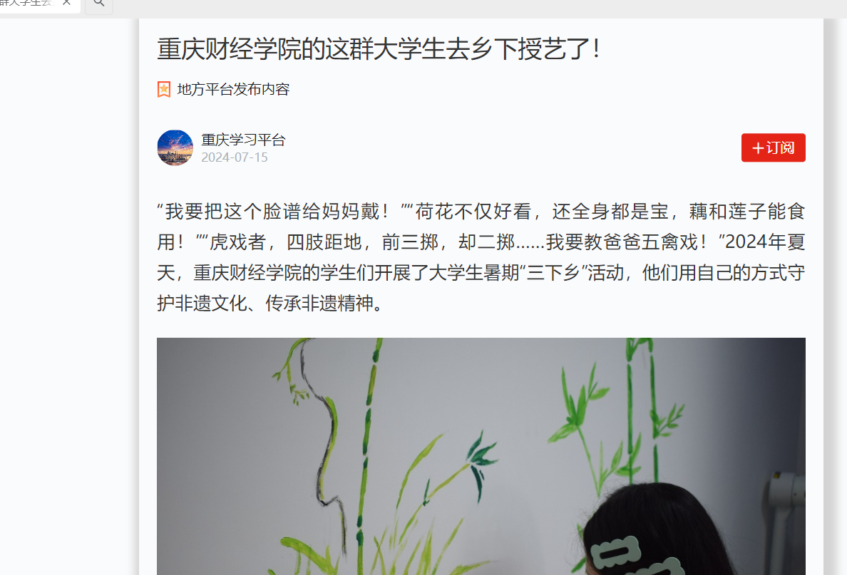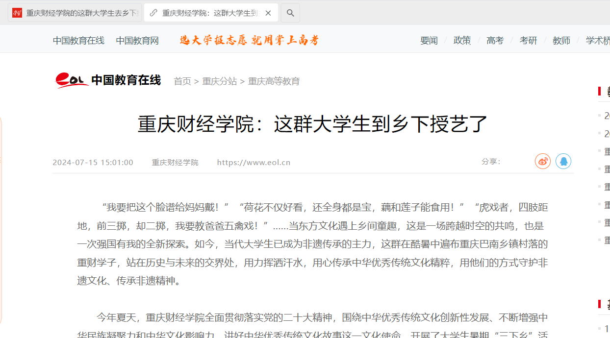 “我要把这个脸谱给妈妈戴!”“荷花不仅好看,还全身都是宝,藕和莲子能食用!”“虎戏者,四肢距地,前三掷,却二掷,我要教爸爸五禽戏!”……当东方文化遇上乡间童趣,这是一场跨越时空的共鸣,也是一次强国有我的全新探索。如今,当代大学生已成为非遗传承的主力,这群在酷暑中遍布重庆巴南乡镇村落的重财学子,站在历史与未来的交界处,用力挥洒汗水,用心传承中华优秀传统文化精粹,用他们的方式守护非遗文化、传承非遗精神。