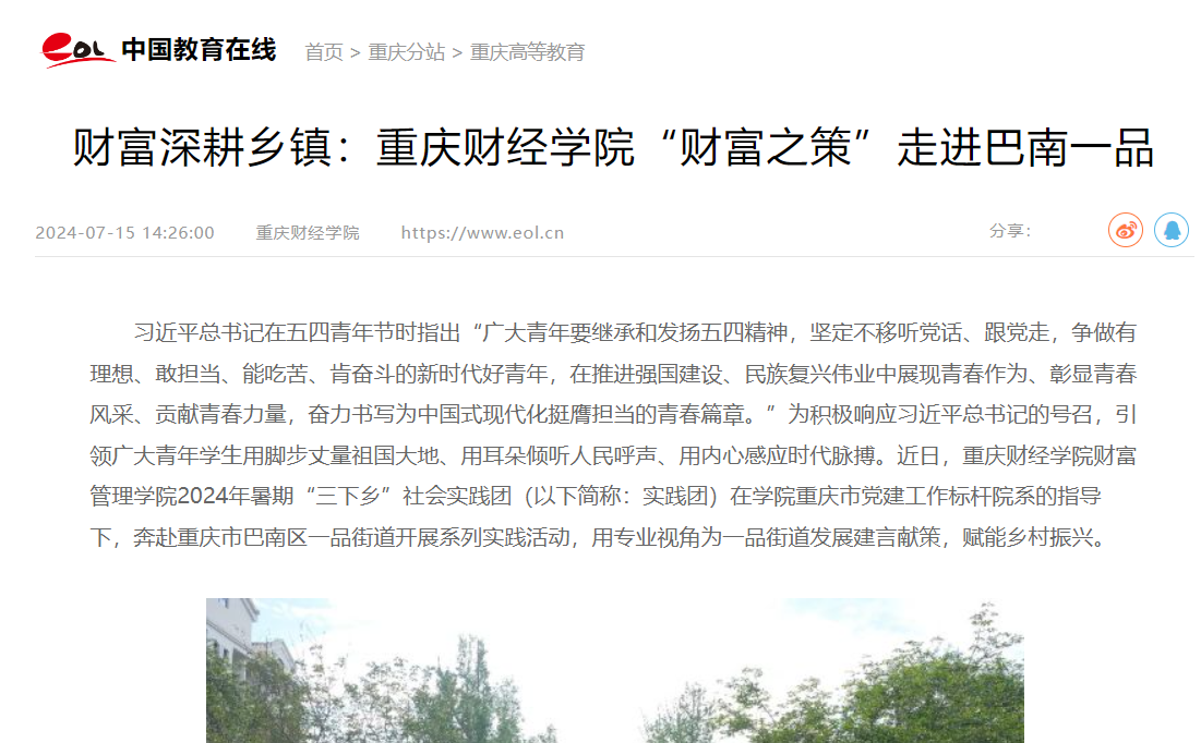 习近平总书记在五四青年节时指出“广大青年要继承和发扬五四精神,坚定不移听党话、跟党走,争做有理想、敢担当、能吃苦、肯奋斗的新时代好青年,在推进强国建设、民族复兴伟业中展现青春作为、彰显青春风采、贡献青春力量,奋力书写为中国式现代化挺膺担当的青春篇章。”为积极响应习近平总书记的号召,引领广大青年学生用脚步丈量祖国大地、用耳朵倾听人民呼声、用内心感应时代脉搏。近日,澳门新葡京博彩财富管理学院2024年暑期“三下乡”社会实践团(以下简称:实践团)在学院重庆市党建工作标杆院系的指导下,奔赴重庆市巴南区一品街道开展系列实践活动,用专业视角为一品街道发展建言献策,赋能乡村振兴。