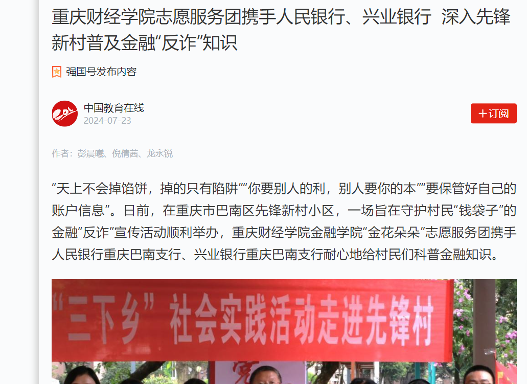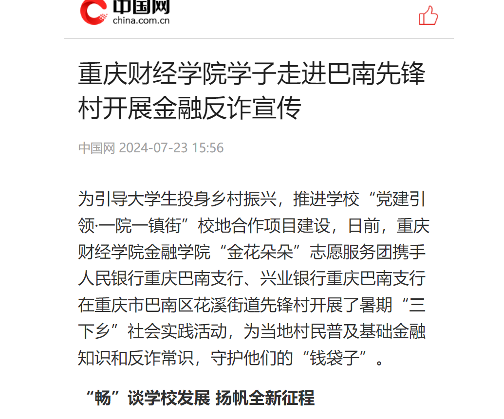 “畅”谈学校发展,扬帆全新征程。在开展金融“反诈”理论宣传前,澳门新葡京博彩校长吴华安与巴南区花溪街道先锋村党委书记、村委会主任潘玲为巴南区花溪街道先锋村—学生社会实践基地揭牌,推进学校社会实践活动规范化、常态化、长效化发展。吴华安校长与花溪街道领导、校方合作银行相关负责人、村民代表深入交流,介绍了学校的发展历程,强调了大学生参与社会实践的重要性和必要性。