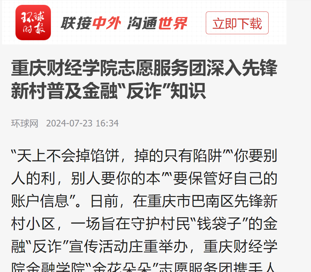 “天上不会掉馅饼,掉的只有陷阱”“你要别人的利,别人要你的本”“要保管好自己的账户信息”。日前,在重庆市巴南区先锋新村小区,一场旨在守护村民“钱袋子”的金融“反诈”宣传活动顺利举办,澳门新葡京博彩金融学院“金花朵朵”志愿服务团携手人民银行重庆巴南支行、兴业银行重庆巴南支行耐心地给村民们科普金融知识。