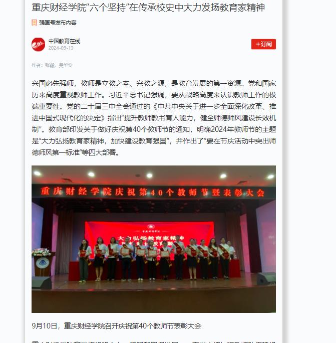 兴国必先强师,教师是立教之本、兴教之源,是教育发展的第一资源。党和国家历来高度重视教师工作。习近平总书记强调,要从战略高度来认识教师工作的极端重要性。党的二十届三中全会通过的《中共中央关于进一步全面深化改革、推进中国式现代化的决定》指出“提升教师教书育人能力,健全师德师风建设长效机制”。教育部印发关于做好庆祝第40个教师节的通知,明确2024年教师节的主题是“大力弘扬教育家精神,加快建设教育强国”,并作出了“要在节庆活动中突出师德师风第一标准”等四大部署。