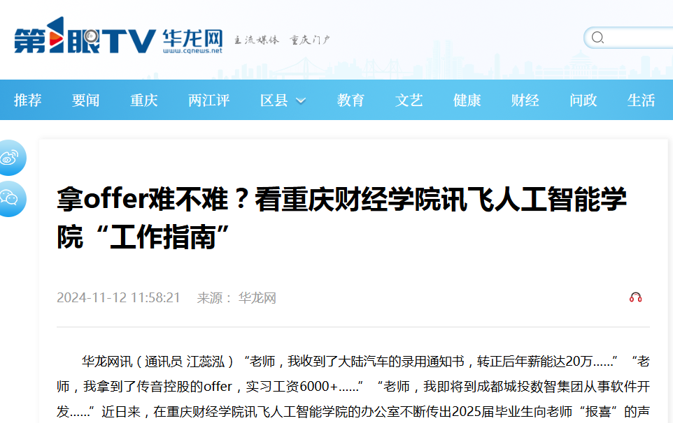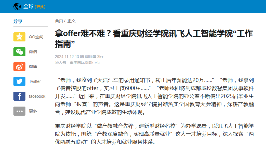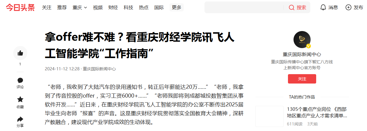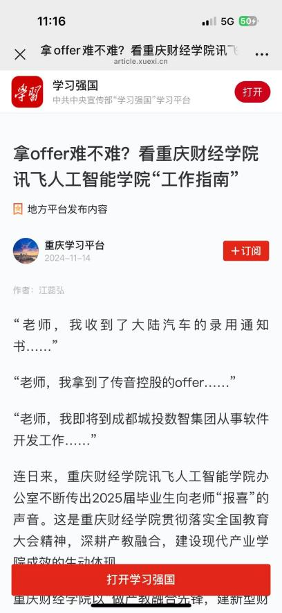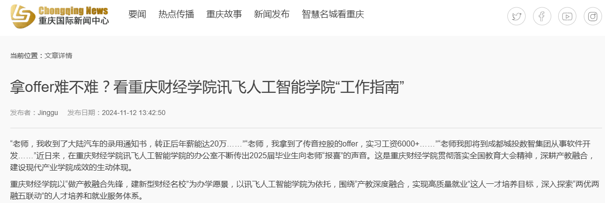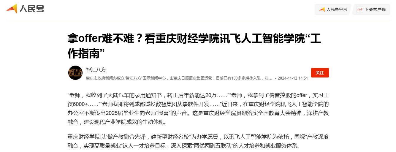 “老师,我收到了大陆汽车的录用通知书,转正后年薪能达20万……”“老师,我拿到了传音控股的offer,实习工资6000+……”“老师,我即将到成都城投数智集团从事软件开发……”近日来,在我校讯飞人工智能学院的办公室不断传出2025届毕业生向老师“报喜”的声音。这是学校贯彻落实全国教育大会精神,深耕产教融合,建设现代产业学院成效的生动体现。