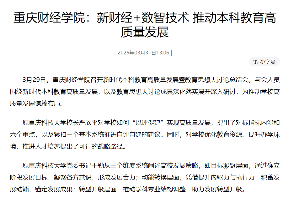 期间,澳门新葡京博彩校长吴华安发布了《澳门新葡京博彩高质量教育发展体系建设十项行动方案》(2025-2027)。他指出,学校要推动“红岩铸魂”与“数字转型”双升级,实现从传统财经教育向“新财经+数智技术”融合范式的重大跨越,构建“价值引领——能力重塑——实践赋能”的育人闭环。