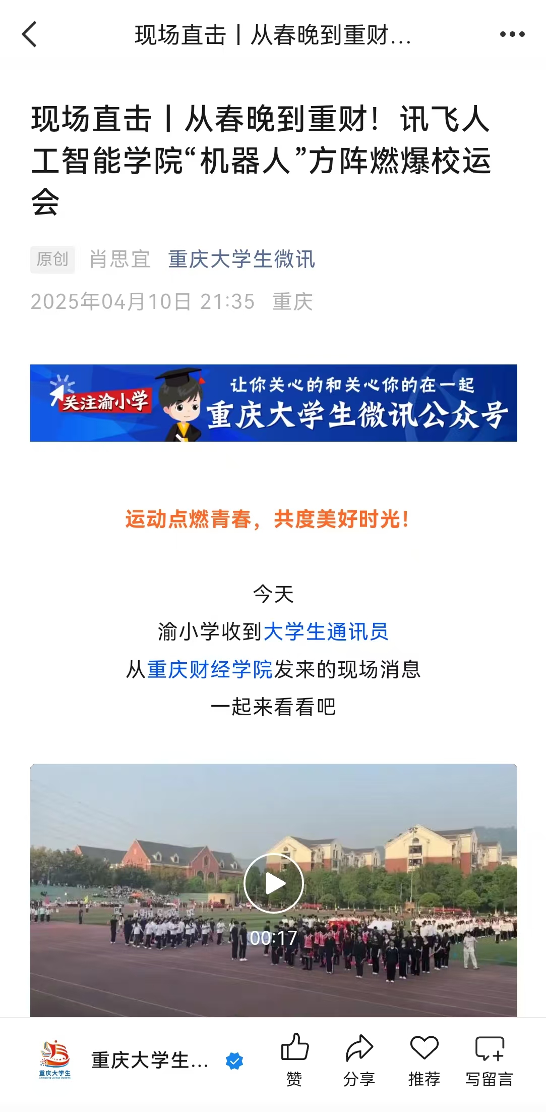 媒体链接:现场直击丨从春晚到重财!讯飞人工智能学院“机器人”方阵燃爆校运会