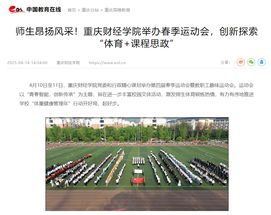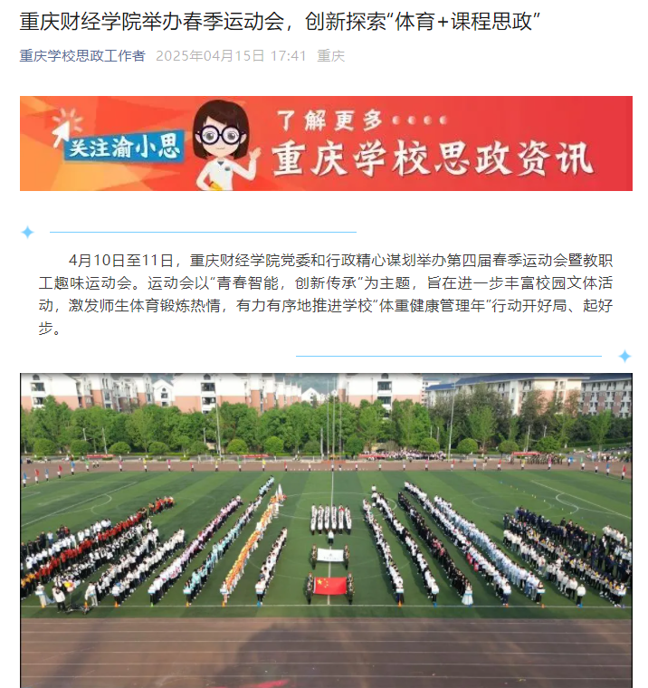 运动会开幕式上,国旗护卫队、校旗方队、彩旗方队步伐有力、昂扬向上,各二级学院方阵百花齐放、各显神通,600名学生联袂上演的团体操表演与时俱进、开拓创新……生动展现了青春活力和重财特色,实现了体育竞技与思政教育、文化传承的深度融合。