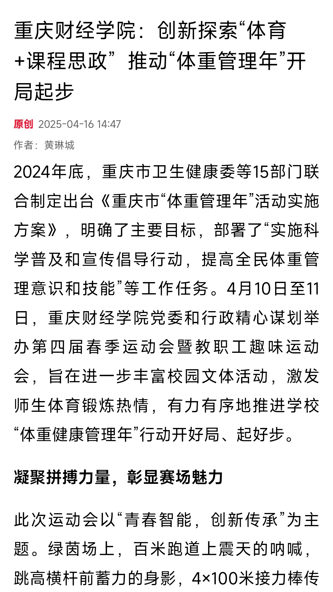 要以体育实践赋能五育融合,健全育人格局。要全面总结本届运动会“文化赋能、科技增色”的创新经验,积极响应国家“体重管理年”战略部署,联动工会、团委组织开展各类文体活动,着力打造“智慧体育”教学平台,建设“健康重财”大数据系统,有机融入校园文化建设体系,不断探索重财实践,打造特色化标志性成果,让体重管理成为校园新风尚,让五育并举赋予重财新内涵。