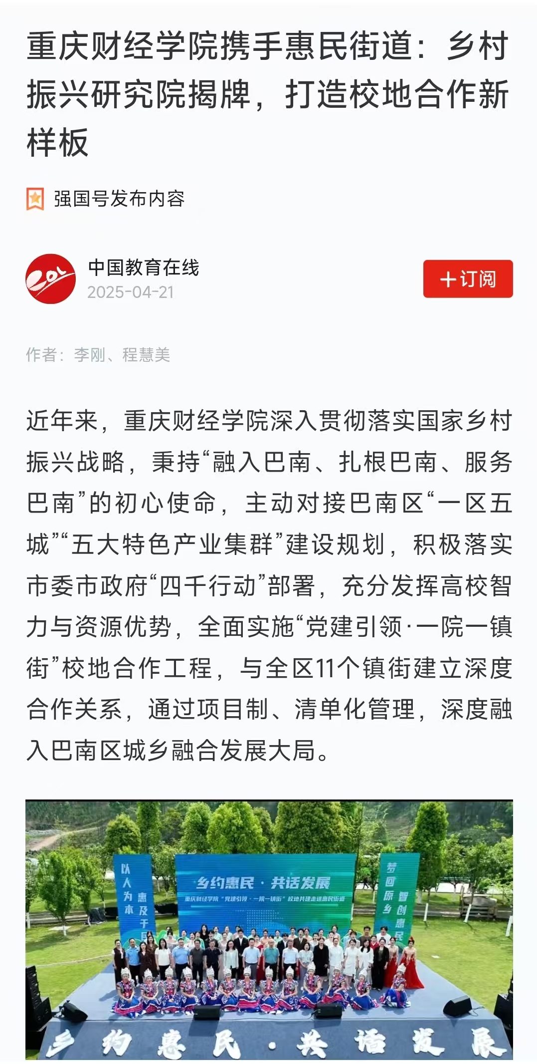 当前,巴南区正全力推进农业强区建设,打造重庆市城乡融合乡村振兴示范区。未来,学校将重点围绕“创新链、产业链、人才链”深度融合,在乡村治理、产业升级、人才培养等领域持续发力,深入推进“党建引领·一院一镇街”校地合作,共同书写乡村振兴的精彩华章。