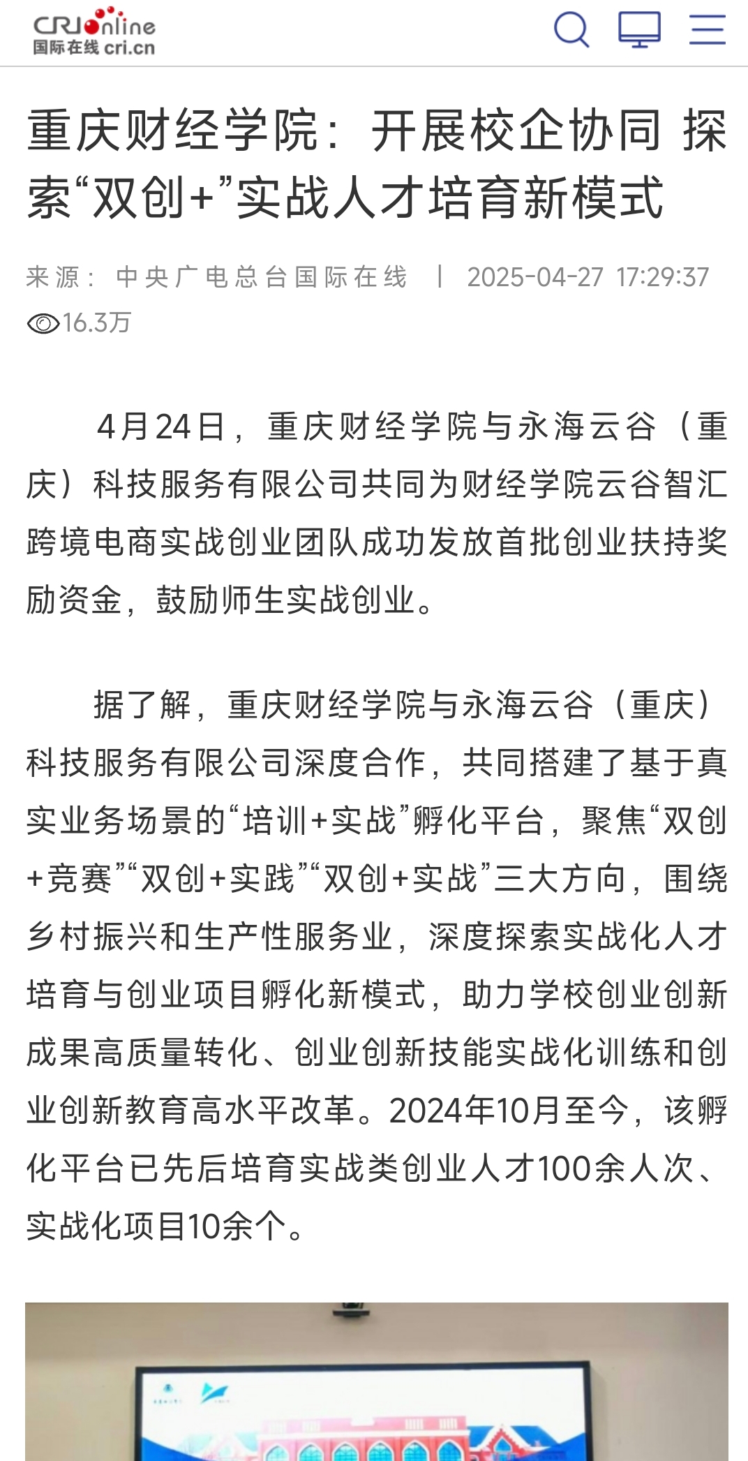 2024年10月至今,已先后培育实战类创业人才100余人次,实战化项目10余个。2025年4月24日,重财教育商学院院长曾真与永海云谷总经理袁嘉云共同为财经学院云谷智汇跨境电商实战创业团队成功发放首批2000元创业扶持奖励资金,鼓励师生实战创业。