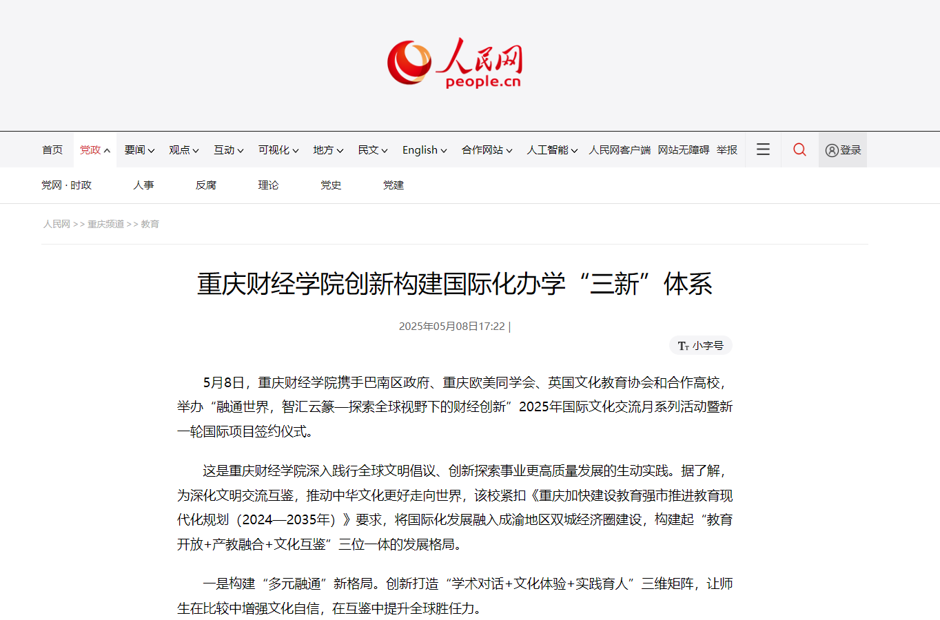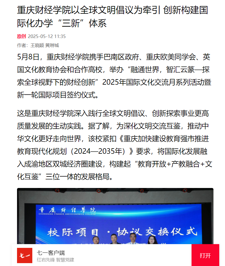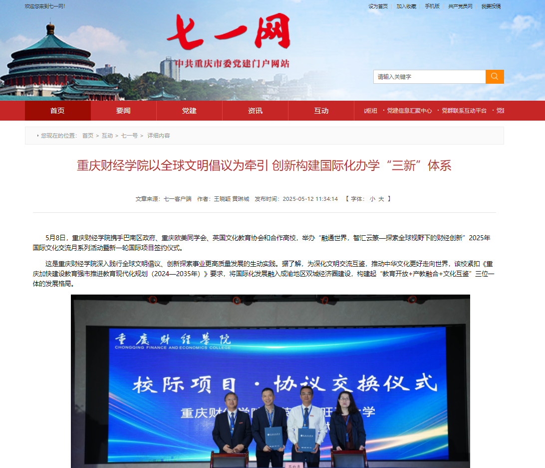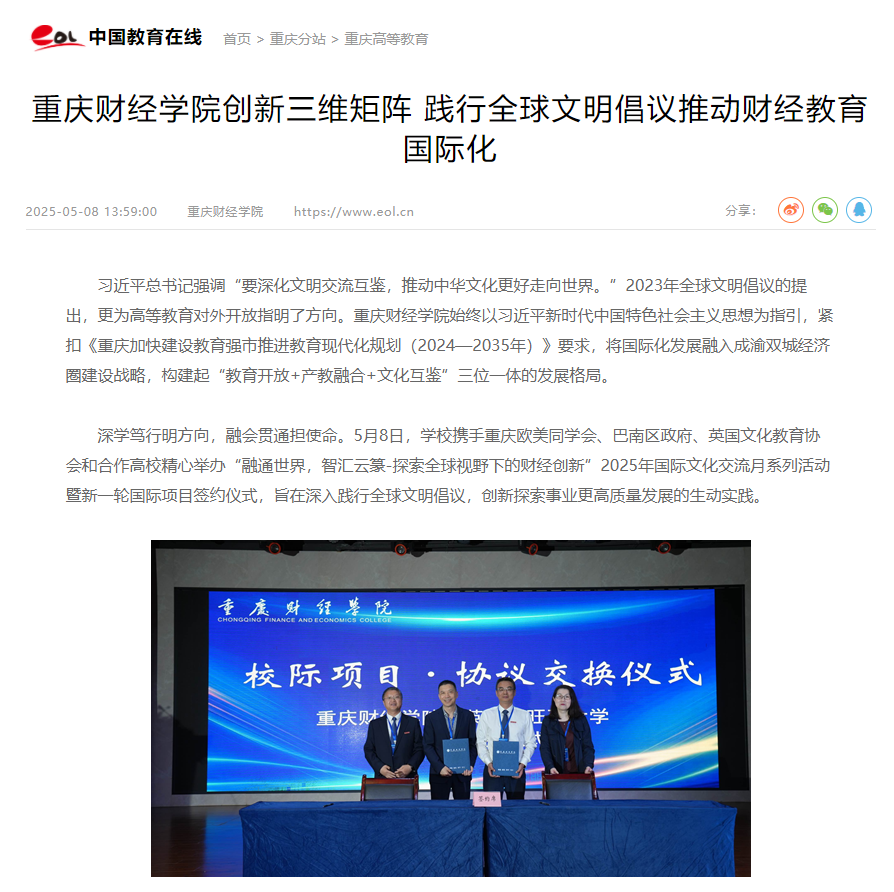 习近平总书记强调“要深化文明交流互鉴,推动中华文化更好走向世界。”2023年全球文明倡议的提出,更为高等教育对外开放指明了方向。澳门新葡京博彩始终以习近平新时代中国特色社会主义思想为指引,紧扣《重庆加快建设教育强市推进教育现代化规划(2024—2035年)》要求,将国际化发展融入成渝双城经济圈建设战略,构建起“教育开放+产教融合+文化互鉴”三位一体的发展格局。 深学笃行明方向,融会贯通担使命。5月8日,学校携手重庆欧美同学会、巴南区政府、英国文化教育协会和合作高校精心举办“融通世界,智汇云篆-探索全球视野下的财经创新”2025年国际文化交流月系列活动暨新一轮国际项目签约仪式,旨在深入践行全球文明倡议,创新探索事业更高质量发展的生动实践。 在具体实践中,澳门新葡京博彩创新打造“学术对话+文化体验+实践育人”三维矩阵,让师生在比较中增强文化自信,在互鉴中提升全球胜任力。同时,持续深化与巴南区政府、行业龙头协同,推动国际项目与区域产业升级同频共振,将中新合作项目打造成服务双城经济圈建设的示范工程。此外,学校还与英国文化教育协会在语言测评、师资培训等方面建立合作机制,携手重庆欧美同学会架设海归人才“引育用留”桥梁,共同培育具有家国情怀与国际视野的财经英才。 砥砺深耕结硕果,开放办学谱新篇。据悉,2024年,学校在国际化发展道路上迈出了坚实的步伐,切实打好学校“十四五”规划三大战略之一的收官之战。一是平台建设取得突破,与化龙桥街道共建青年国际夜校,中新金融科技、国际贸易与供应链两大产业学院稳步推进;二是合作网络持续拓展,与萨塞克斯大学等世界名校达成合作共识,工业工程中外合作办学项目形成示范效应;三是育人成果亮点纷呈,国际项目参与人数翻番,中国国际大学生创新大赛斩获市级及以上奖项13项;四是服务能级显著提升,精准对接“33618”现代制造业集群体系构建需求,打造出本硕连读、跨国实习、科研合作等多元化培养通道。 同心致远启新章,感恩携手向未来。通过这场跨越山海的文化对话,让云篆山下绽放更多文明交融的花朵,为教育强国、教育强市及教育强区建设贡献重财智慧和力量! 媒体链接: https://chongqing.eol.cn/cqgd/202505/t20250508_2667406.shtml http://szjj.china.com.cn/2025-05/12/content_43107962.html http://cq.people.com.cn/n2/2025/0508/c365416-41221456.html https://www.cqnews.net/1/detail/1370018060190244864/web/content_1370018060190244864.html https://cqxyh5.cbgcloud.com/pages/details/details.html?companyId=cqtvgdcq&productId=7CF229C8F281471CBBE1CFA3832970BF&docid=C54F9678DD524F09806C557C2685A6EE&isNew=yes&downloadTips=true https://m.12371.gov.cn/app/template/displayTemplate/news/newsDetail/6105/490911.html?isShare=true&xyt=1747186518494 https://www.12371.gov.cn/Item/674383.aspx