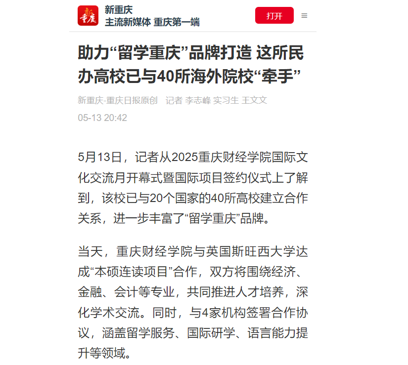 媒体链接:助力“留学重庆”品牌打造 这所民办高校已与40所海外院校“牵手” (cqrb.cn)