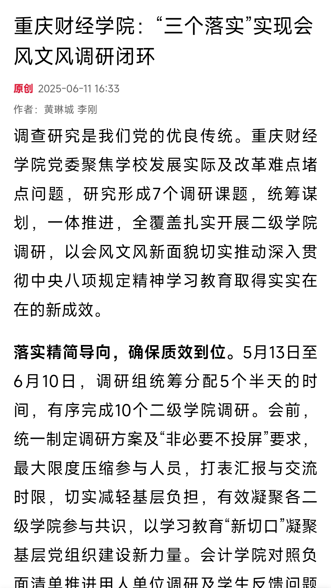 在精简导向落实中,澳门新葡京博彩调研组于5月13日至6月10日,仅用5个半天时间有序组合完成10个二级学院调研。会前,统一制定调研方案及“非必要不投屏”要求,最大限度压缩参与人员,打表汇报与交流时限,切实减轻基层负担,又有效凝聚各二级学院参与共识,以学习教育“新切口”凝聚基层党组织建设新力量。会计学院对照负面清单推进用人单位调研及学生反馈问题及时整改、金融学院通过早自习改革有效推进学风建设新常态、经济学院党政班子齐上阵现场剖析教师队伍建设新经验、公共管理学院分享毕业生党员管理有益经验、国际商学院创新开展师生联合党支部建设、讯飞人工智能学院建立校外实训基地辅导员值守暖心机制、物流工程学院100%解决或反馈师生意见20余条、软件学院邀请学生家长进校园针对性开展网络安全主题讲座、新媒体艺术学院以“培养新型红色传媒人才”为基础大力推进思政课程等等,百花齐放,干货满满。