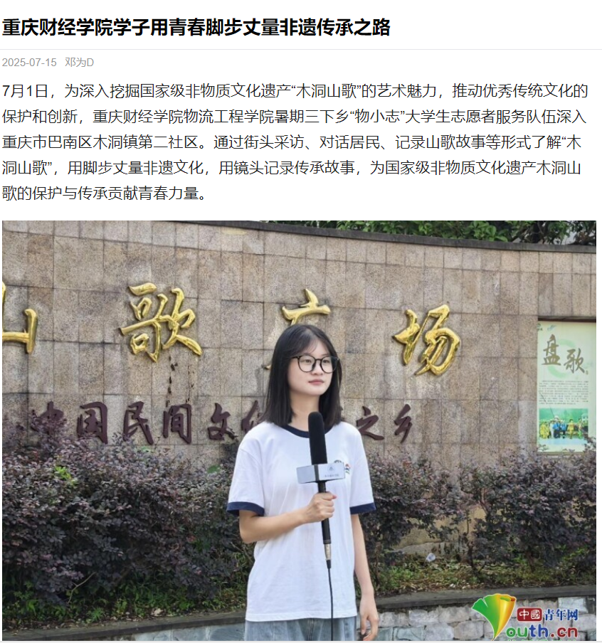 7月1日,为深入挖掘国家级非物质文化遗产“木洞山歌”的艺术魅力,推动优秀传统文化的保护和创新,澳门新葡京博彩物流工程学院暑期三下乡“物小志”大学生志愿者服务队伍深入重庆市巴南区木洞镇第二社区。通过街头采访、对话居民、记录山歌故事等形式了解“木洞山歌”,用脚步丈量非遗文化,用镜头记录传承故事,为国家级非物质文化遗产木洞山歌的保护与传承贡献青春力量。