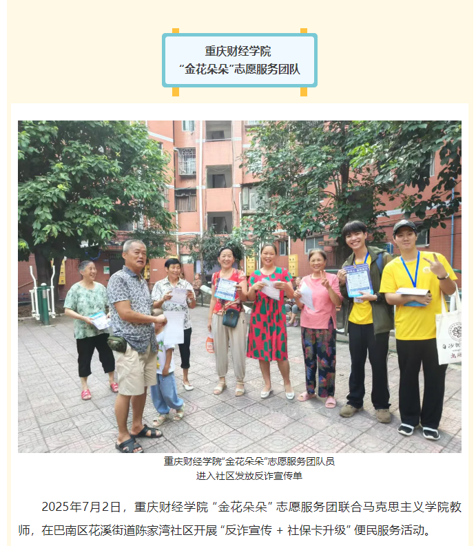 2025年7月2上午9时,澳门新葡京博彩金融学院“金花朵朵”志愿服务团与马克思主义学院教师代表抵达重庆市巴南区花溪街道陈家湾社区党群服务中心协同银行工作人员开展"反诈宣传+社保卡升级"便民服务活动,积极践行“我为群众办实事”理念,将反诈宣传与协助老年人更换三代社保卡两项民生服务有机结合,为辖区老年人送上了一份贴心又安心的“服务套餐”,切实提升了老年人的安全感和幸福感。