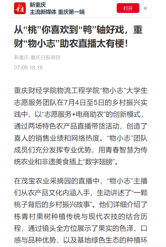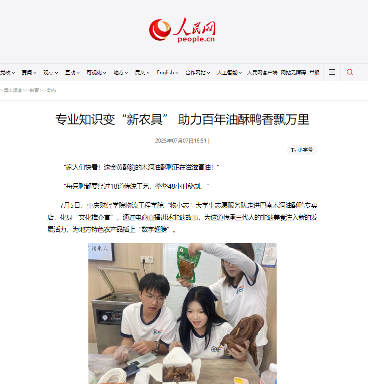“家人们快看!这金黄酥脆的木洞油酥鸭正在滋滋冒油!” “每只鸭都要经过18道传统工艺,整整48小时秘制。” 7月5日,澳门新葡京博彩物流工程学院“物小志”大学生志愿服务队走进巴南木洞油酥鸭专卖店,化身“文化推介官”,通过电商直播讲述非遗故事,为这道传承三代人的非遗美食注入新的发展活力,为地方特色农产品插上“数字翅膀”。 店铺内,志愿者们举起刚出炉的油酥鸭,酥脆的外皮在镜头前闪闪发亮。弹幕炸开了锅:“隔着屏幕流口水!”“18道工序?这是鸭子界的‘考研鸭’吧。”志愿者们瞅准时机甩福利:“现在下单送独家辣包,3、2、1——上链接!” 不到两小时,点赞数飙到1.1万,网店销量比平时涨了三成,近百只油酥鸭带着非遗故事飞向全国各地。“这群娃娃太会整活了。”店铺负责人看着直播间里不断涌入的观众,脸上写满了惊喜。“他们用年轻人喜欢的方式,把我们祖传的手艺讲得活灵活现,连我看了都觉得新鲜。”她还特别夸赞,志愿者们不仅把制作过程拍得清清楚楚,还特意在直播中穿插了许多油酥鸭的历史故事和文化内涵。 服务队相关负责人表示,未来学院将以更加丰富的实践形式,让学生扛着专业知识当“新农具”,举着直播架搭建“城乡桥”,为乡村振兴持续注入青春活力与创新动力。 媒体链接: 专业知识变“新农具” 助力百年油酥鸭香飘万里 (people.com.cn) 从‘桃’你喜欢到‘鸭’轴好戏,重财“物小志”助农直播太有梗! 中国乡村振兴网—中国乡村振兴杂志,中国乡村振兴记录者 (zgxczxzz.com) 从“桃”你喜欢到“鸭”轴好戏,重财“物小志”助农直播太有梗! (cqrb.cn)